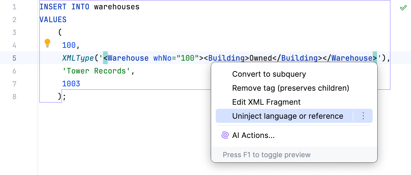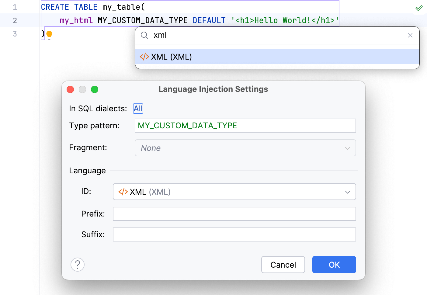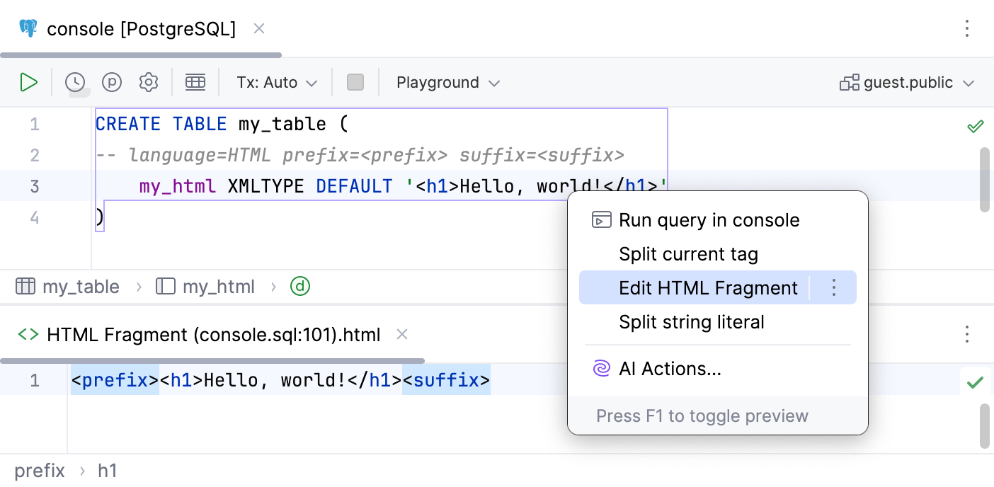 DataGrip will open a dedicated editor section for editing the code with the injected language. This editor provides full coding assistance, including code completion, inspections, intention actions, and code style actions.