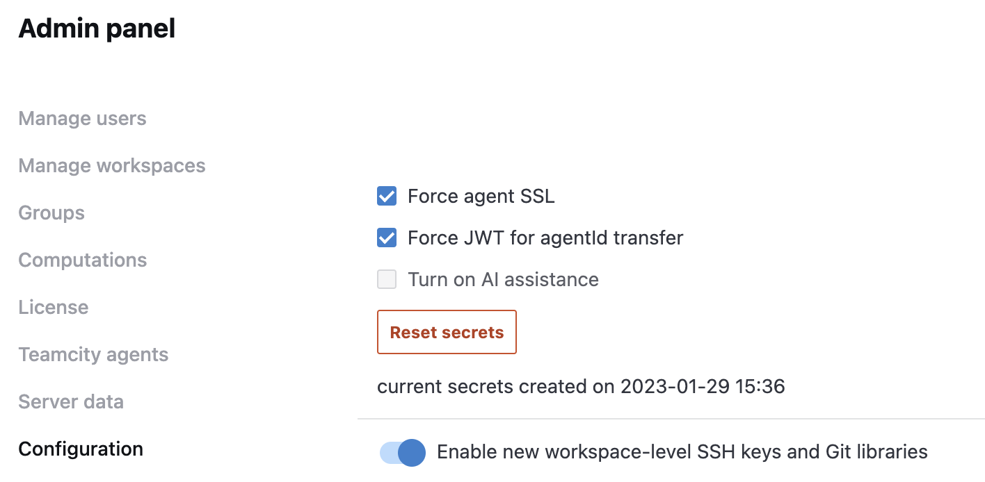 On the Configuration tab, switch the Enable new workspace-level SSH keys and Git libraries toggle.
