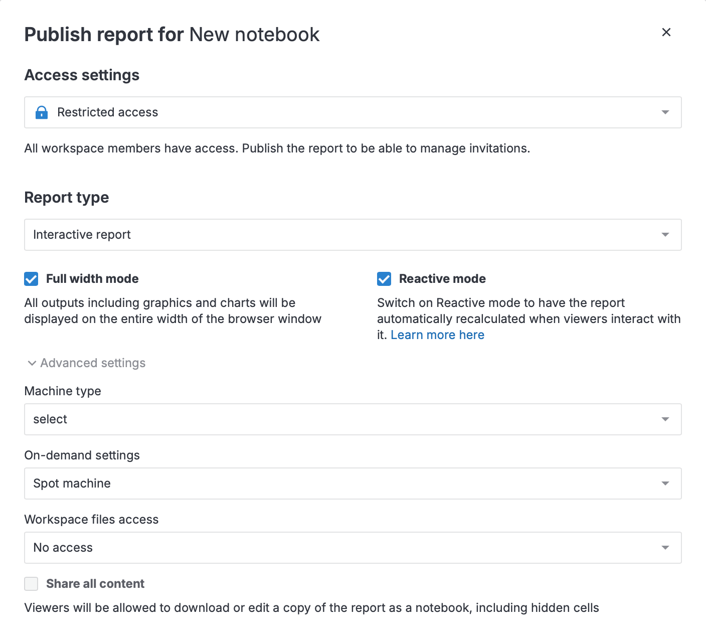 On-demand settings (interactive reports only): Choose a spot or on-demand machine ofr report calculations. By default, the report runs on the same machine type as the source notebook.
