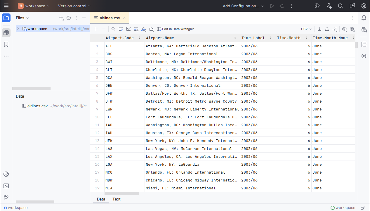 Now airlines.csv is shown in the Data tool window. Double-click the file to open it in the editor: