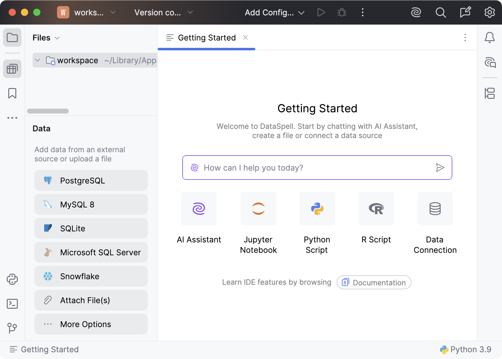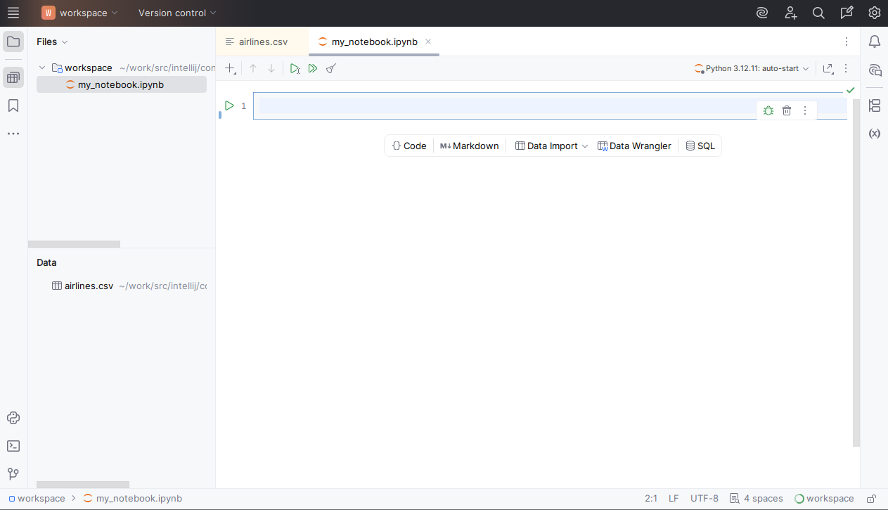 Let's start by running DataSpell. The IDE starts with the default workspace.