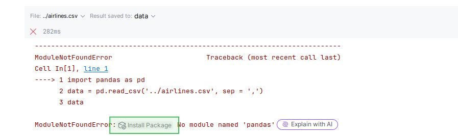 If there is an error about missing pandas library, click Install package button and run the cell again: