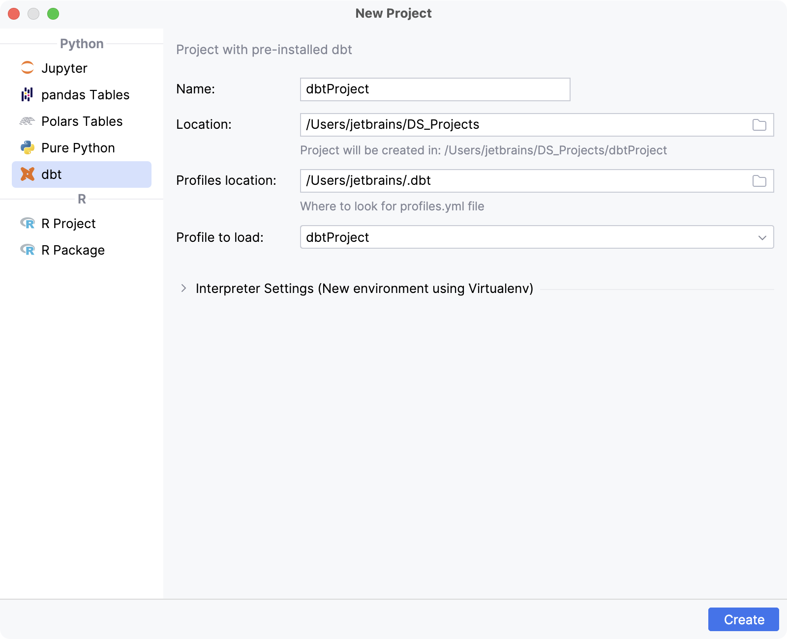 Specify the project name in the Name field and location in the Location field. DataSpell will create the project directory in the provided location.