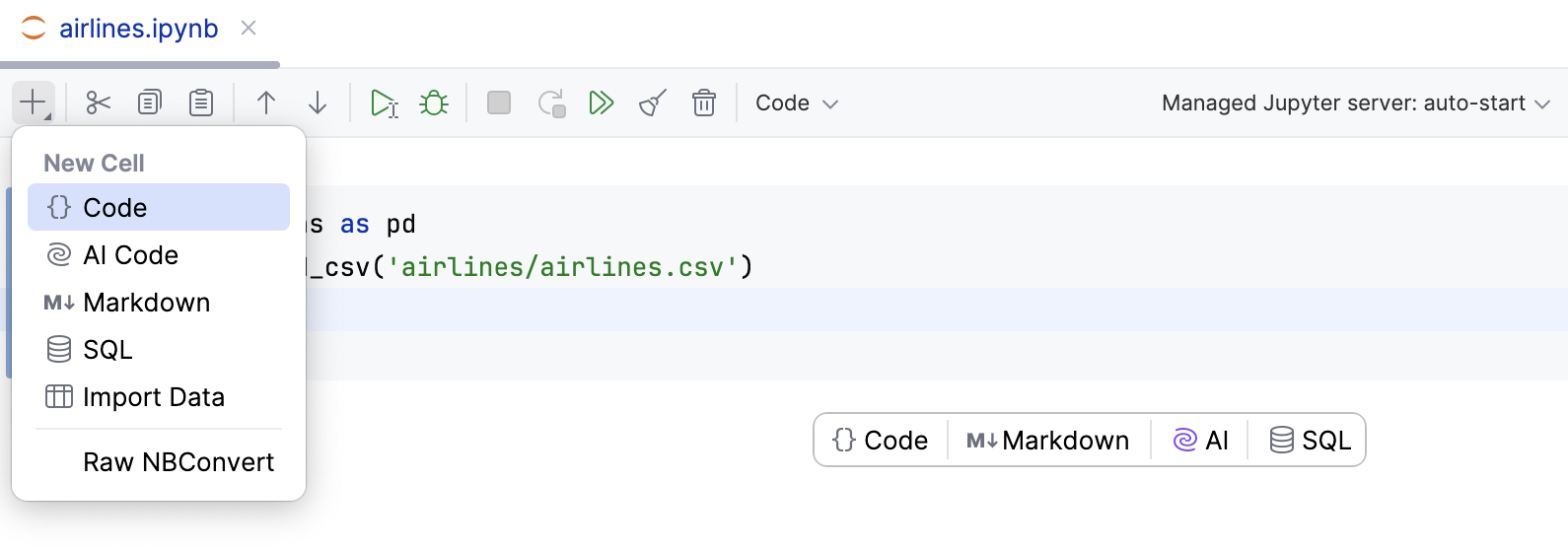 code,Markdown,SQLorAIcells to your notebook: