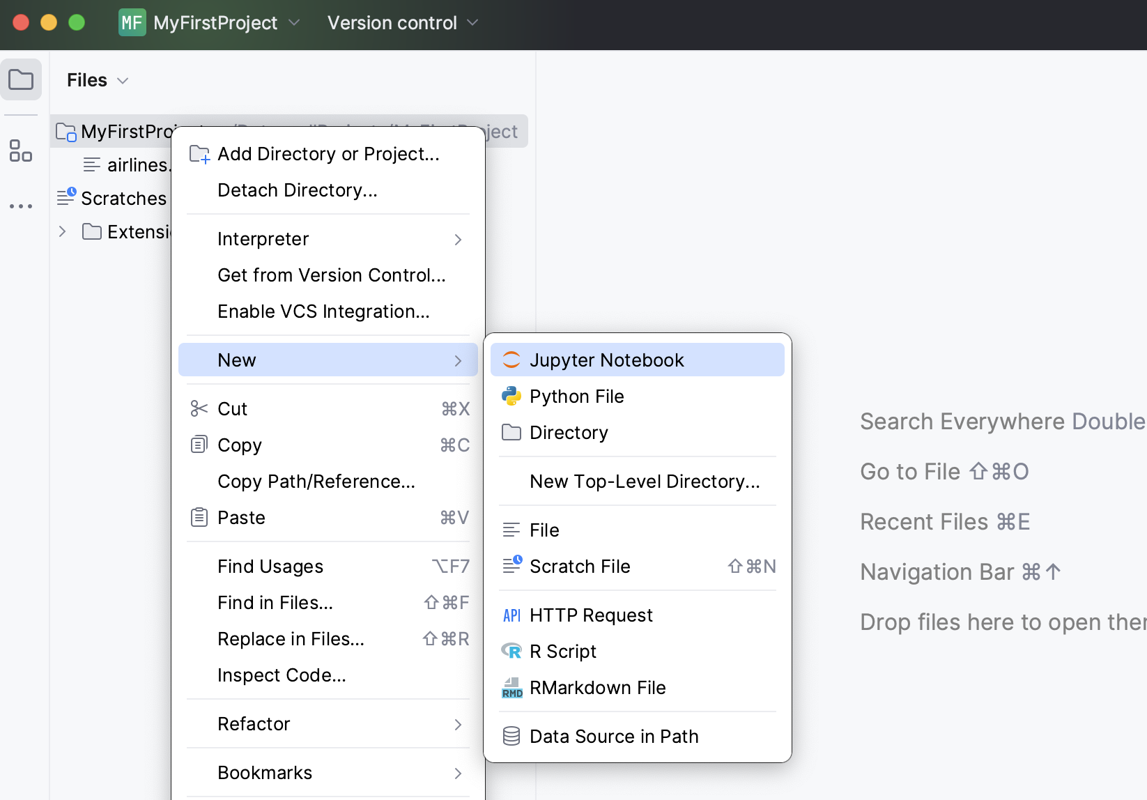 Right-click the Jupyter notebook file in the Project tool window.