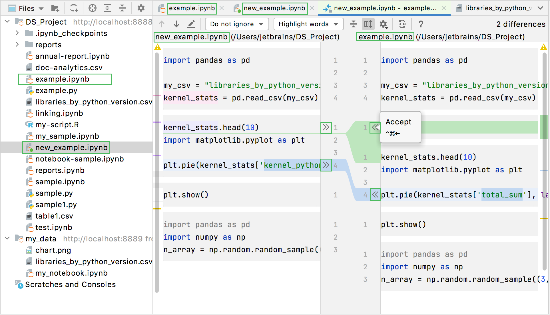 DataSpell shows two notebooks and the comparison results in the diff viewer: