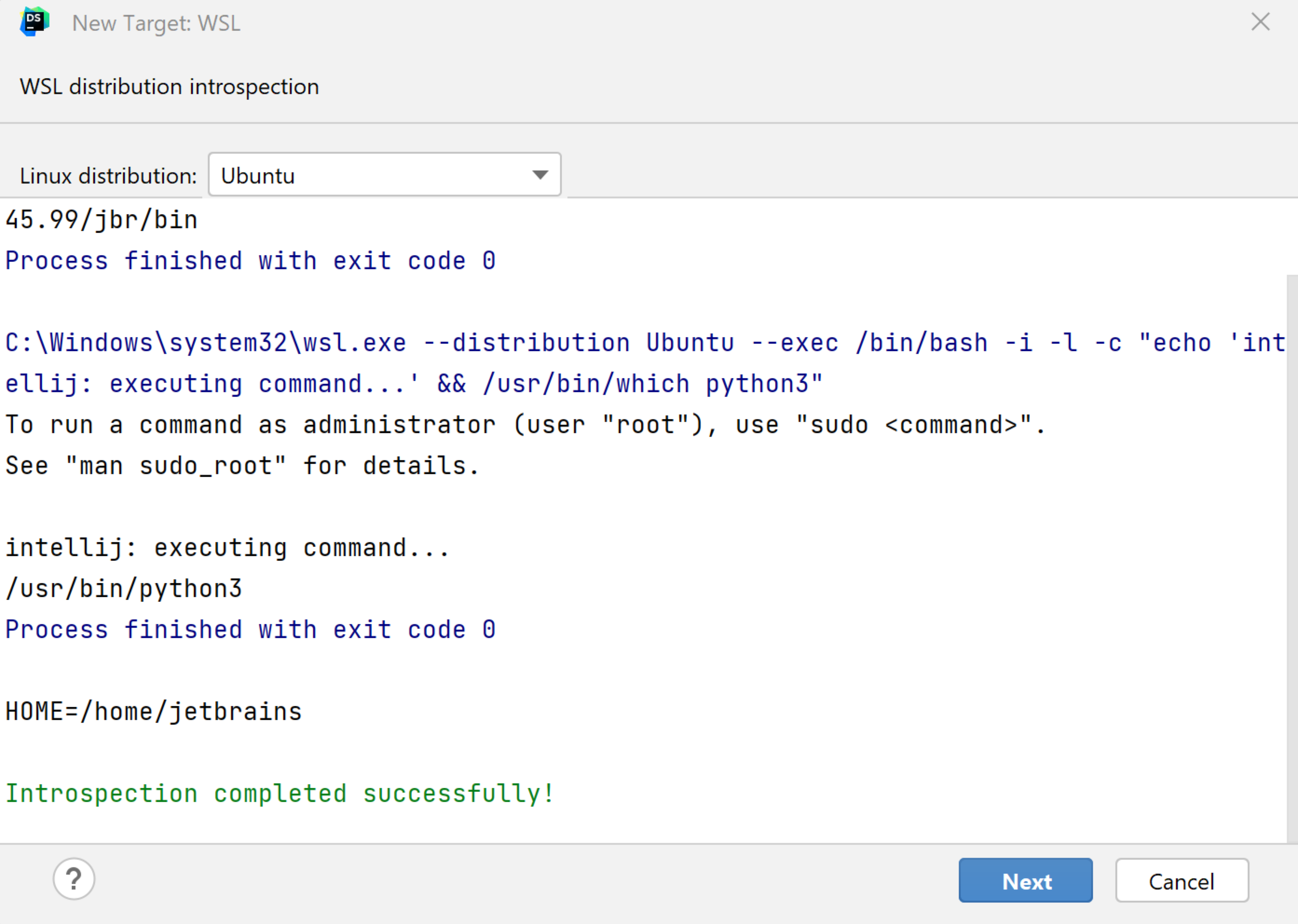 Wait until DataSpell detects Linux on your machine and completes introspection. Click Next to proceed: