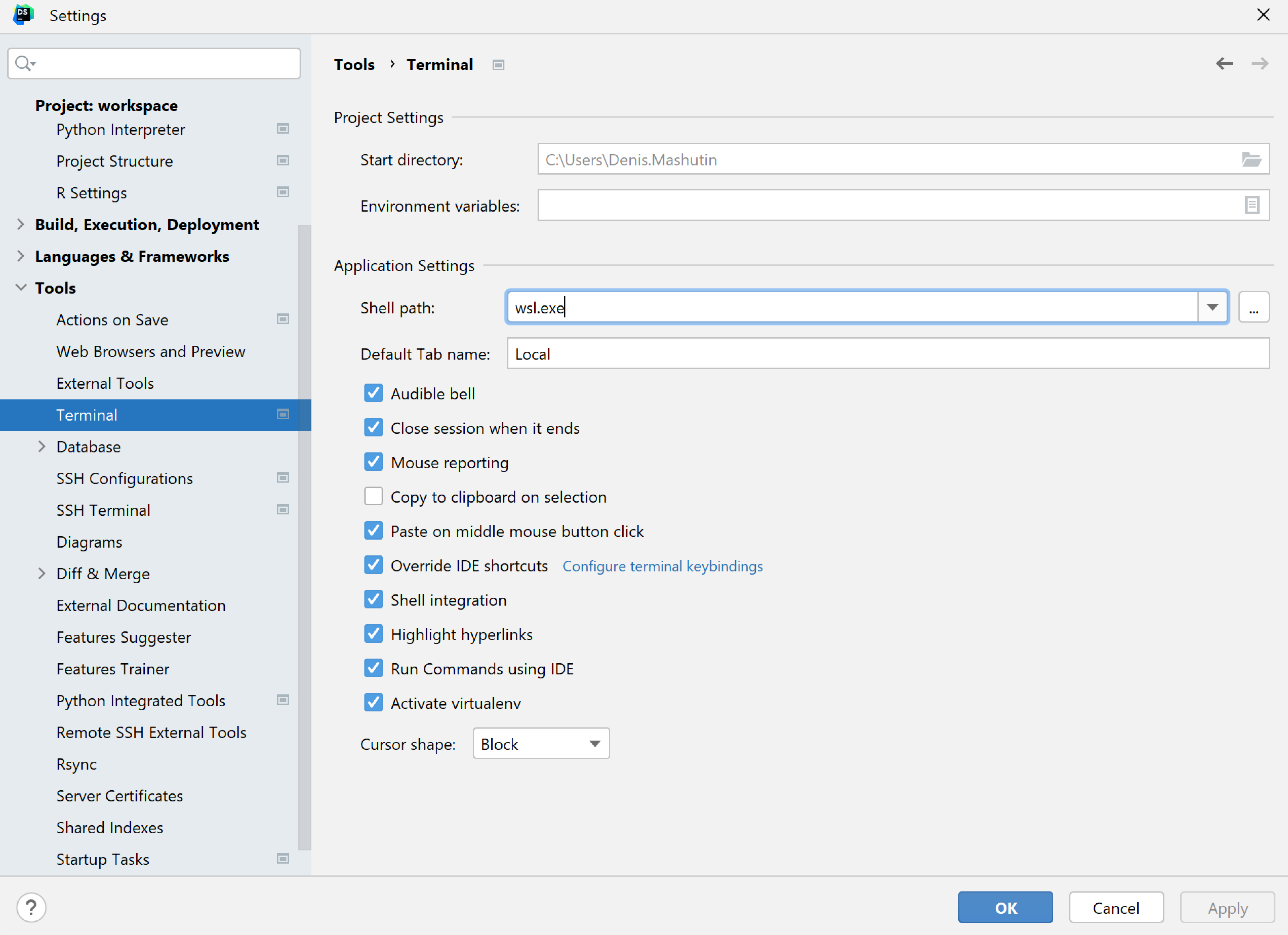 To run Terminal in WSL configuration, open project Settings/Preference (Ctrl+Alt+S) and go to .