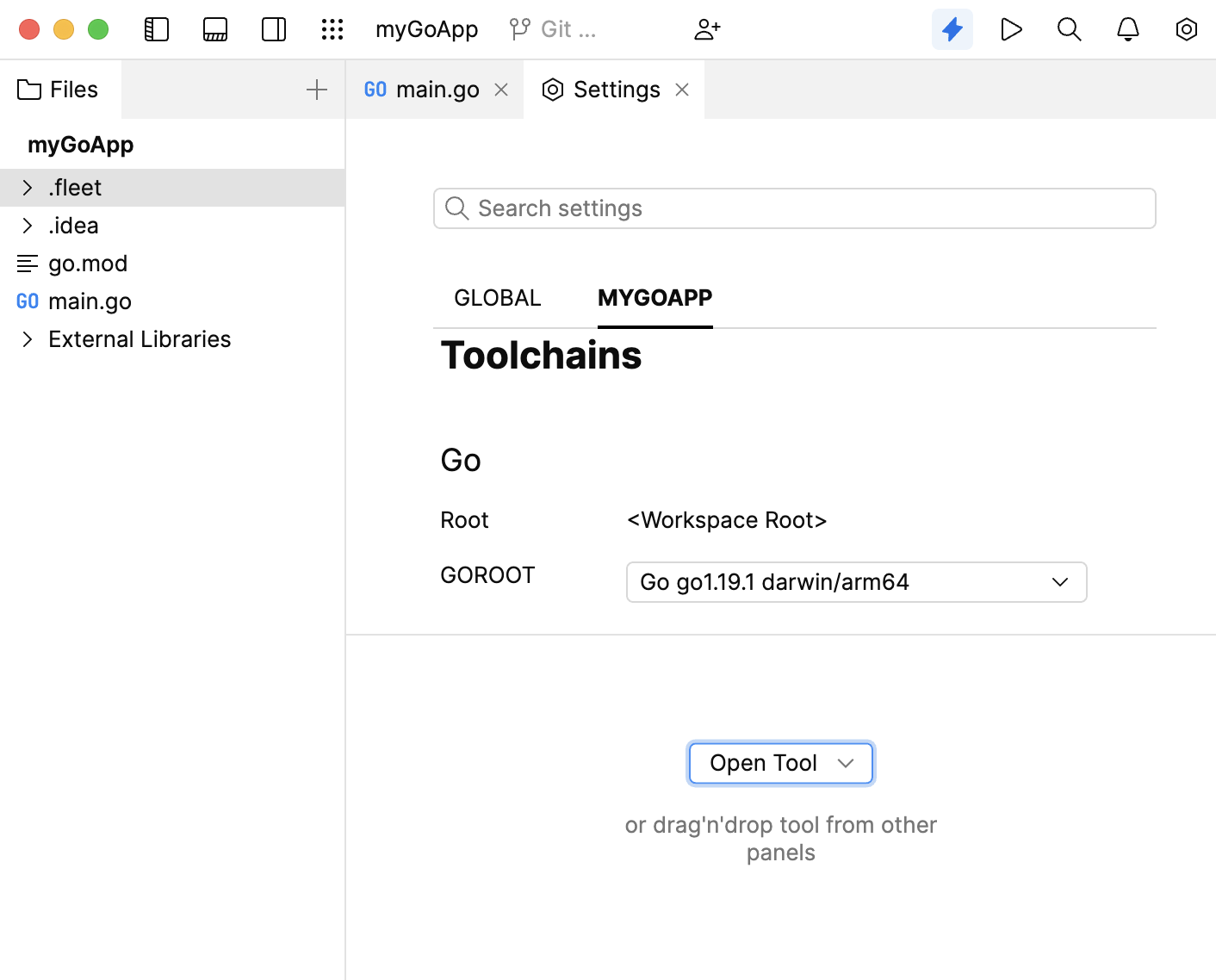 In Smart Mode, which will be covered later, JetBrains Fleet automatically detects a virtual environment and configures a Go SDK. If the automatic SDK detection fails, you can configure GOROOT manually.