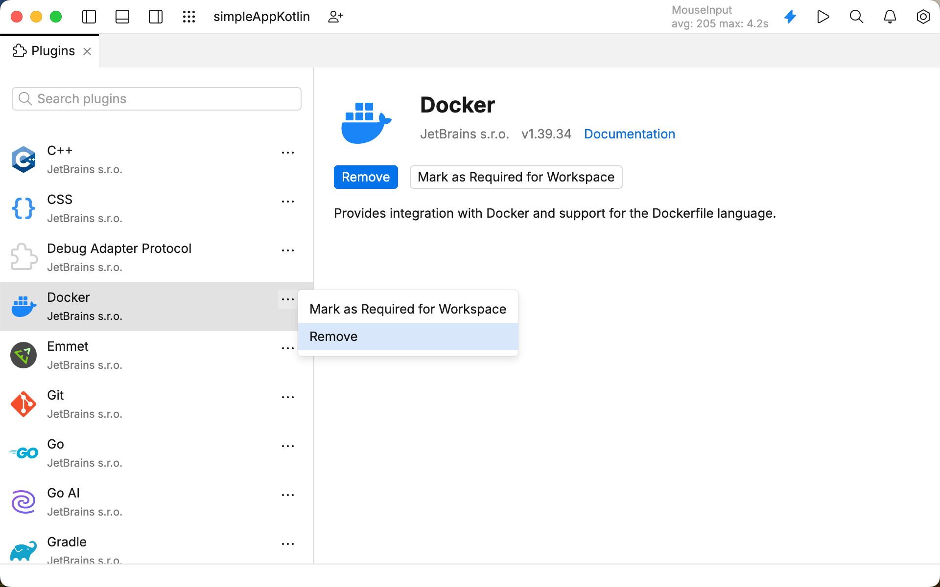 Select the plugin that you want to remove and click the Remove button on the plugin page. Alternatively, click the ellipsis icon (