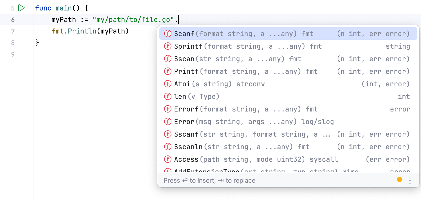 GoLand analyzes the context and suggests the choices that are reachable from the current caret position. Suggestions also include Live templates. Completion is available for a non-English keyboard layout.