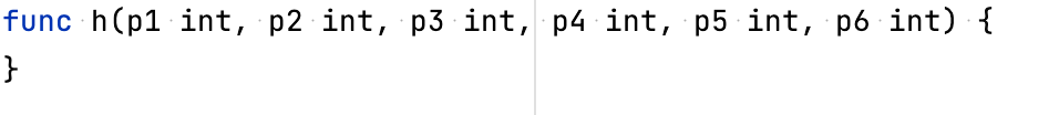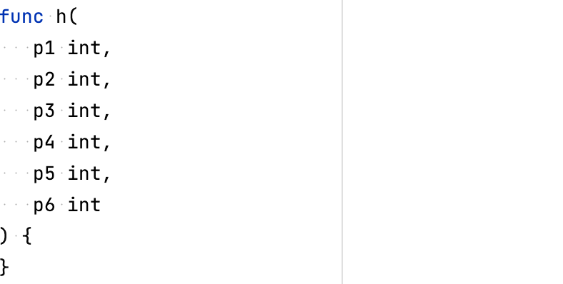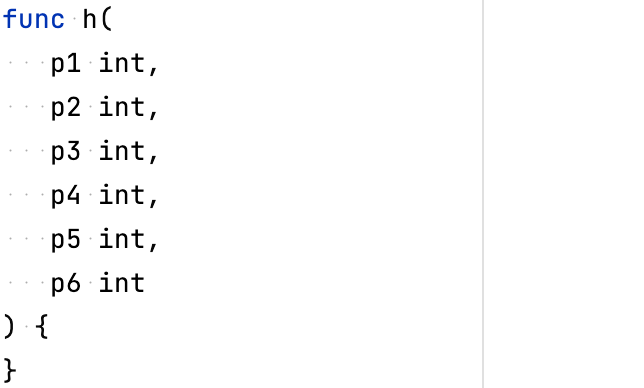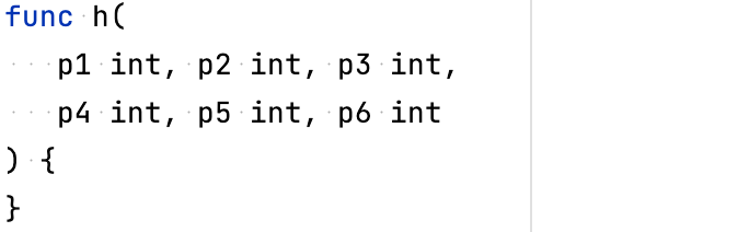 Function parameters | Select wrapping options for function parameters. In Go, function parameters are variables that are declared as part of a function signature and are used to pass data to the function when it is called. The values passed to the function as arguments are assigned to the function's parameters, allowing the function to operate on the data. You can select between the following options: