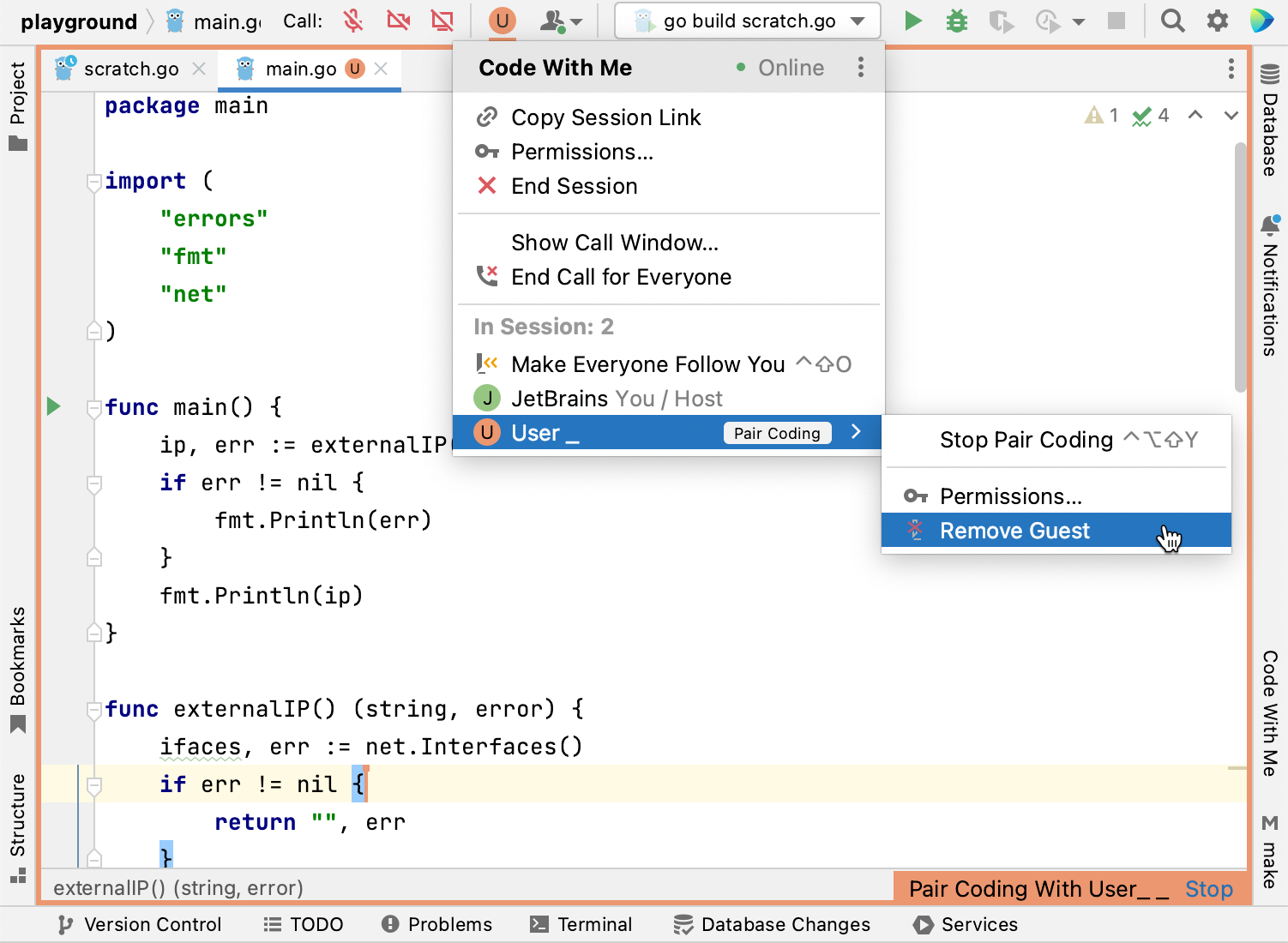 GoLand terminates the session for the selected participant and displays a notification on the guest's side. GoLand closes the guest project and the IDE with the session.