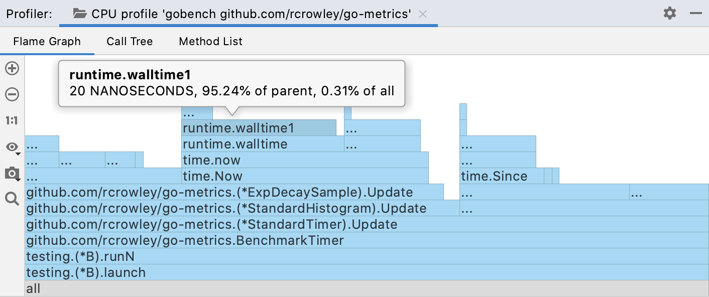 GoLand collects and visualizes CPU profiles, traces, and heap profiles. To collect all the necessary data, GoLand uses the pprof package. GoLand includes four profilers that you can run from the user interface: CPU, memory, blocking (contention), and mutex.