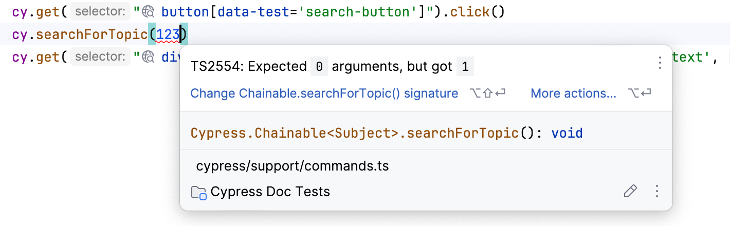 Validation of the command chain is not performed in JavaScript/TypeScript, and in Cypress it is performed only at runtime, which may lead to issues during the test execution. GoLand, in its turn, provides an inspection for chained commands, highlighting incorrect usages.
