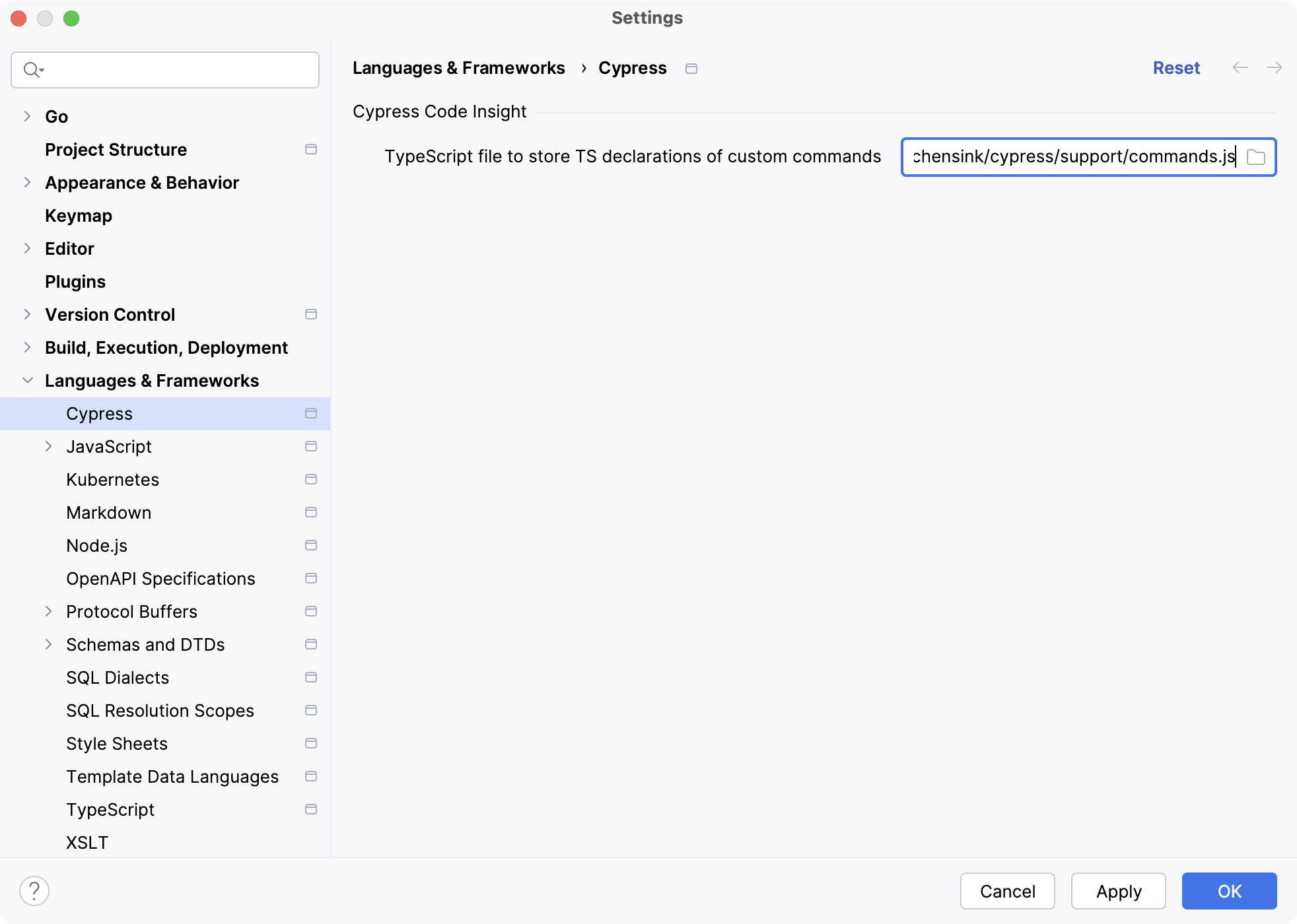 By default, the file that contains the generated TypeScript declaration is located at cypress/support/commands.ts. If you want to change the location:
