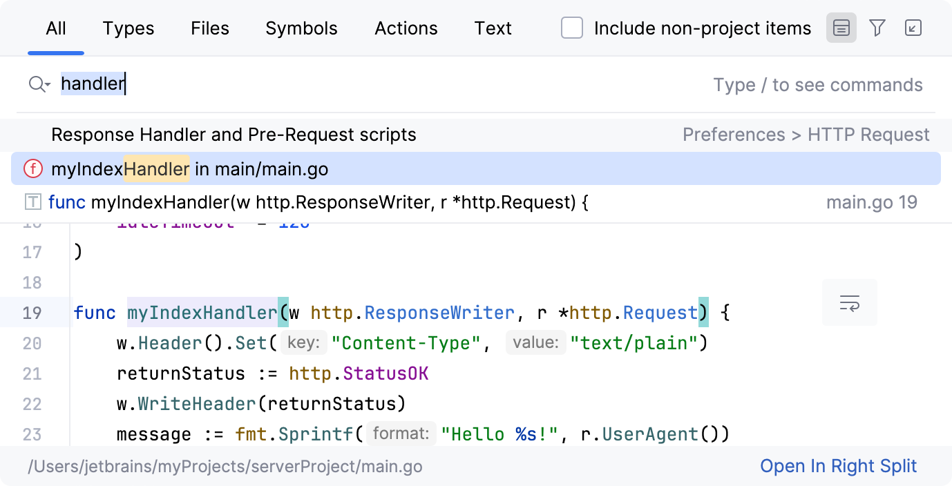 Search Everywhere is your replacement for Command Palette in VS Code. You can use it to search for files, actions, classes, or symbols. All matches are displayed in a single location.