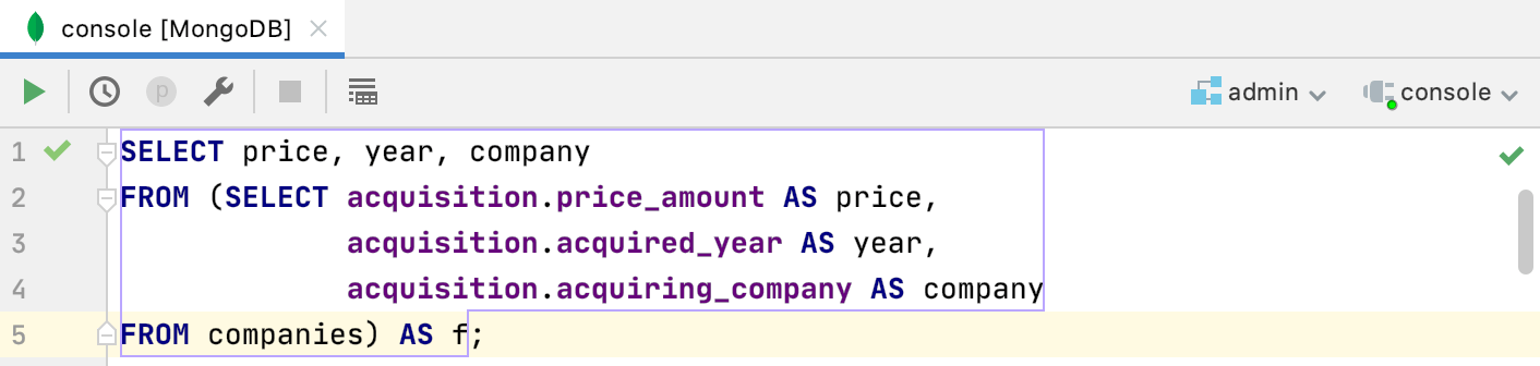 In MongoDB and Amazon DocumentDB, to manipulate data or perform other operations, you write scripts for the mongo shell in JavaScript. For developers who query data primarily with SQL, it might be helpful to use SQL for MongoDB or Amazon DocumentDB collections as well. GoLand will translate your SQL queries to JavaScript.