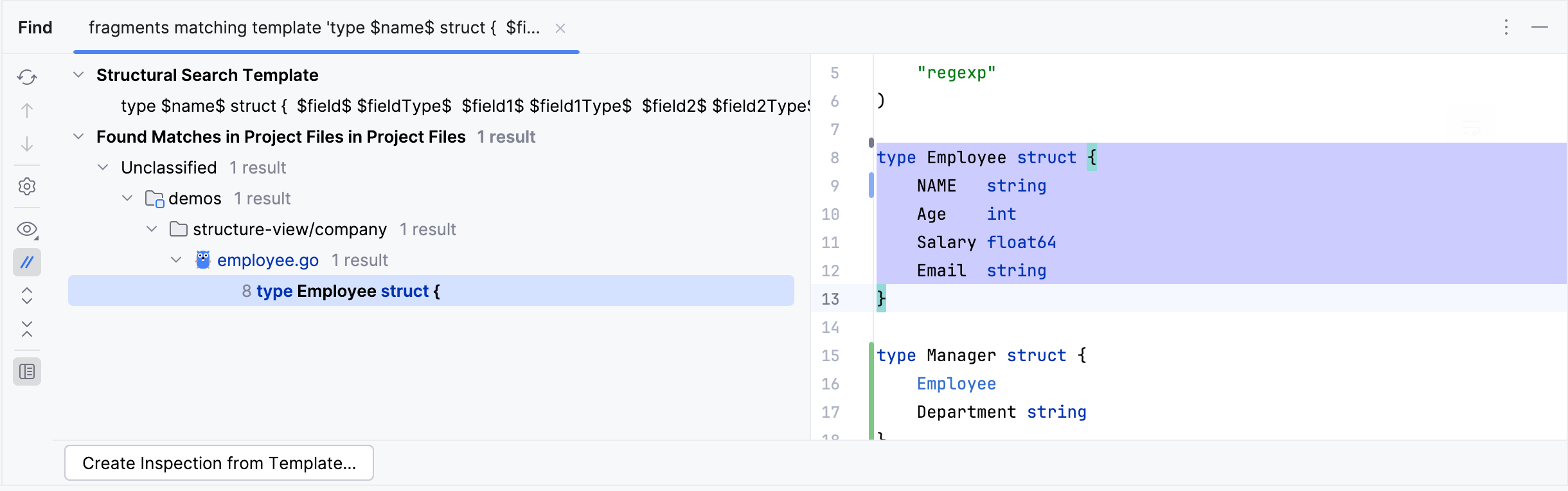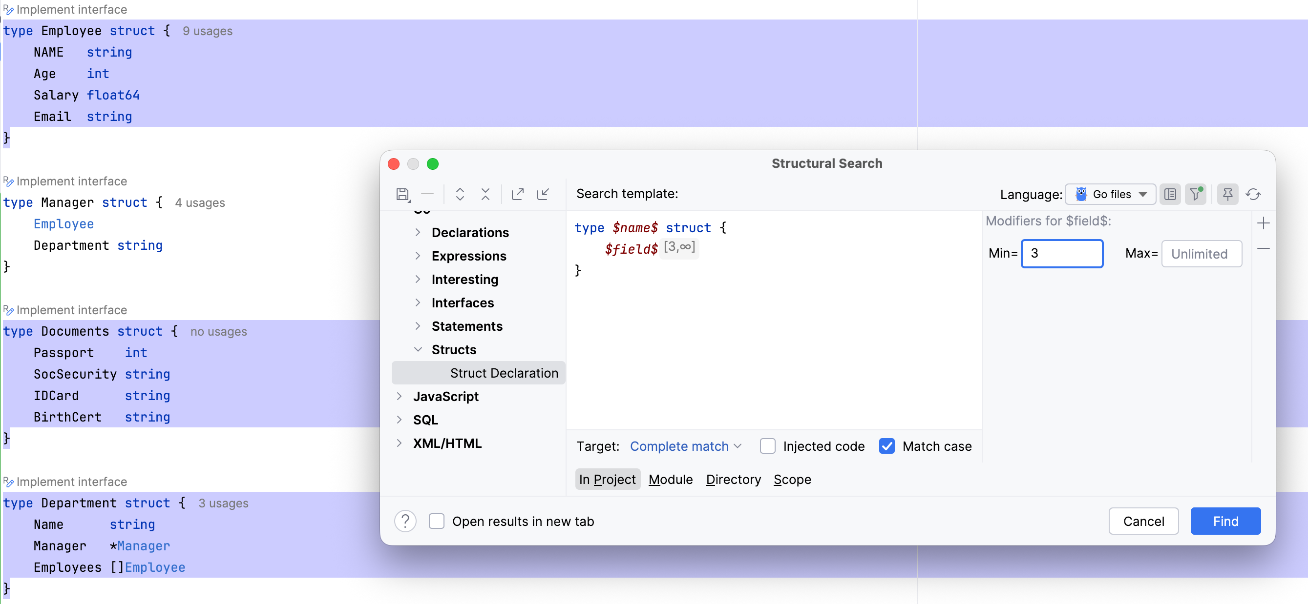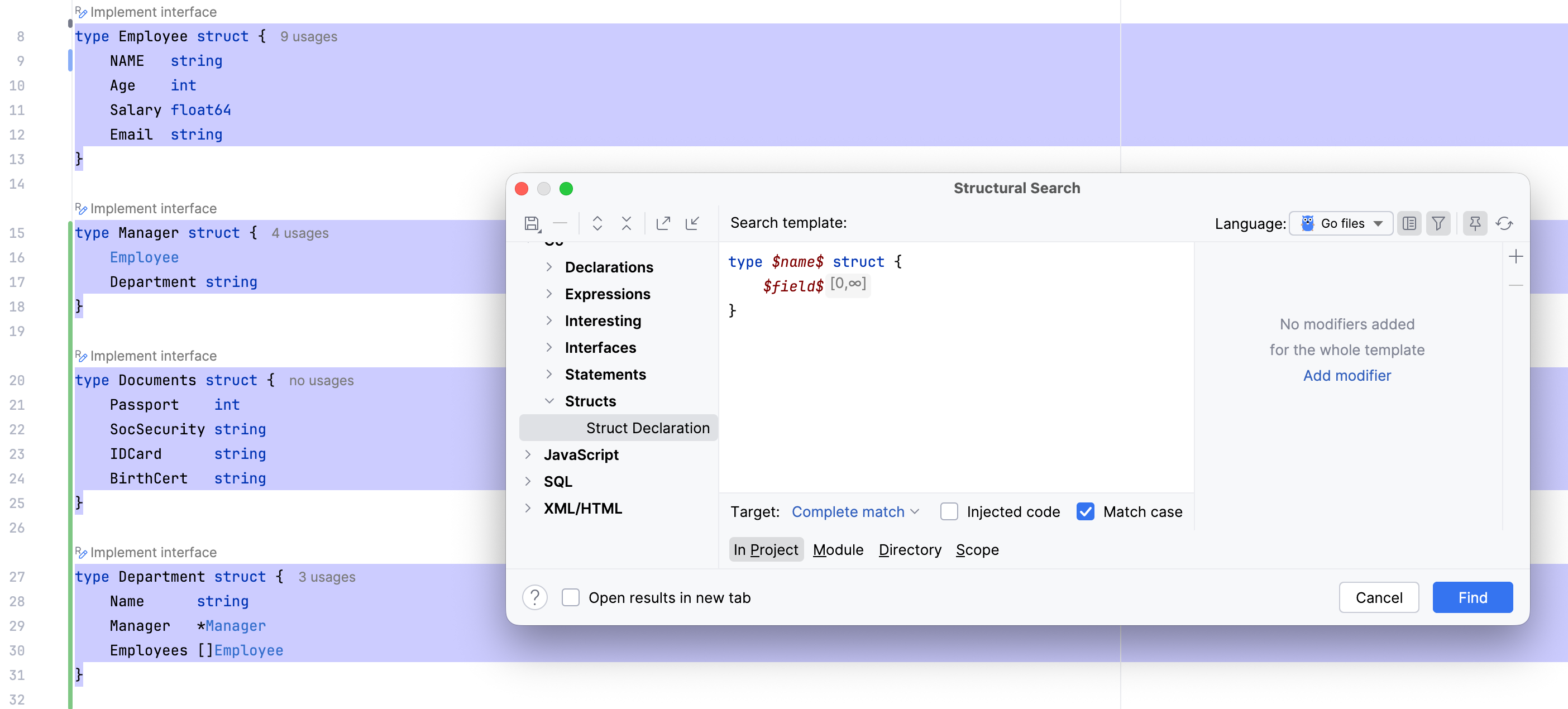 A conventional search process does not take into account the syntax and semantics of the source code. Even if you use regular expressions, GoLand still treats your code as a regular text. The structural search and replace (SSR) actions let you search for a particular code pattern or grammatical construct in your code considering your code structure.