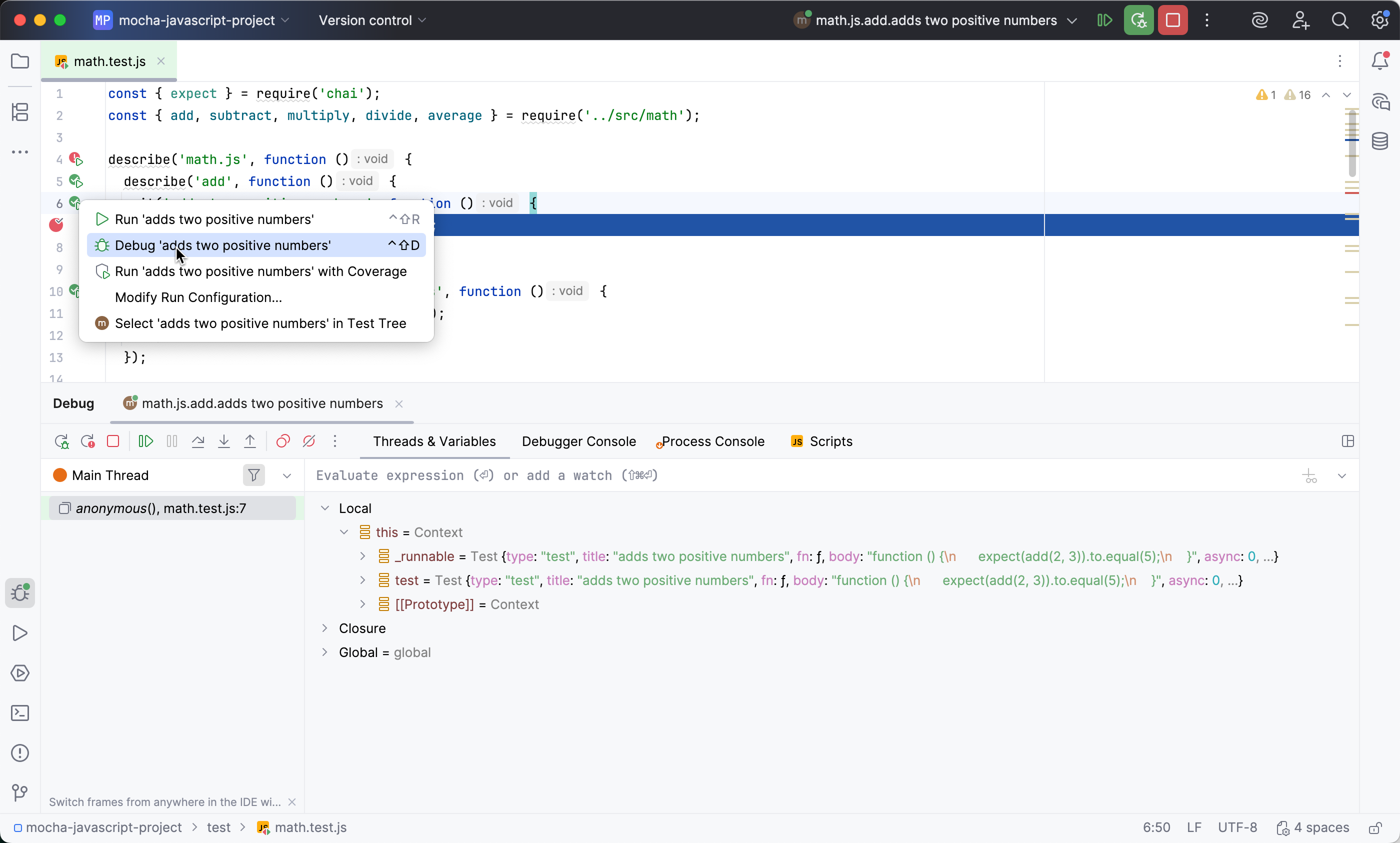 With GoLand, you can quickly run a single Mocha test right from the editor or create a run/debug configuration to execute some or all of your tests.