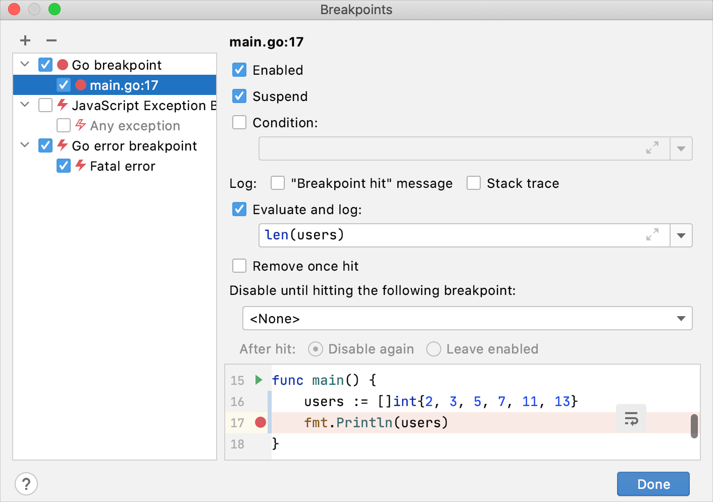 The following types of breakpoints are available in GoLand: