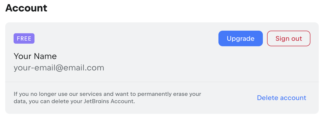 Delete account | Deletes your JetBrains Account along with all your data. |