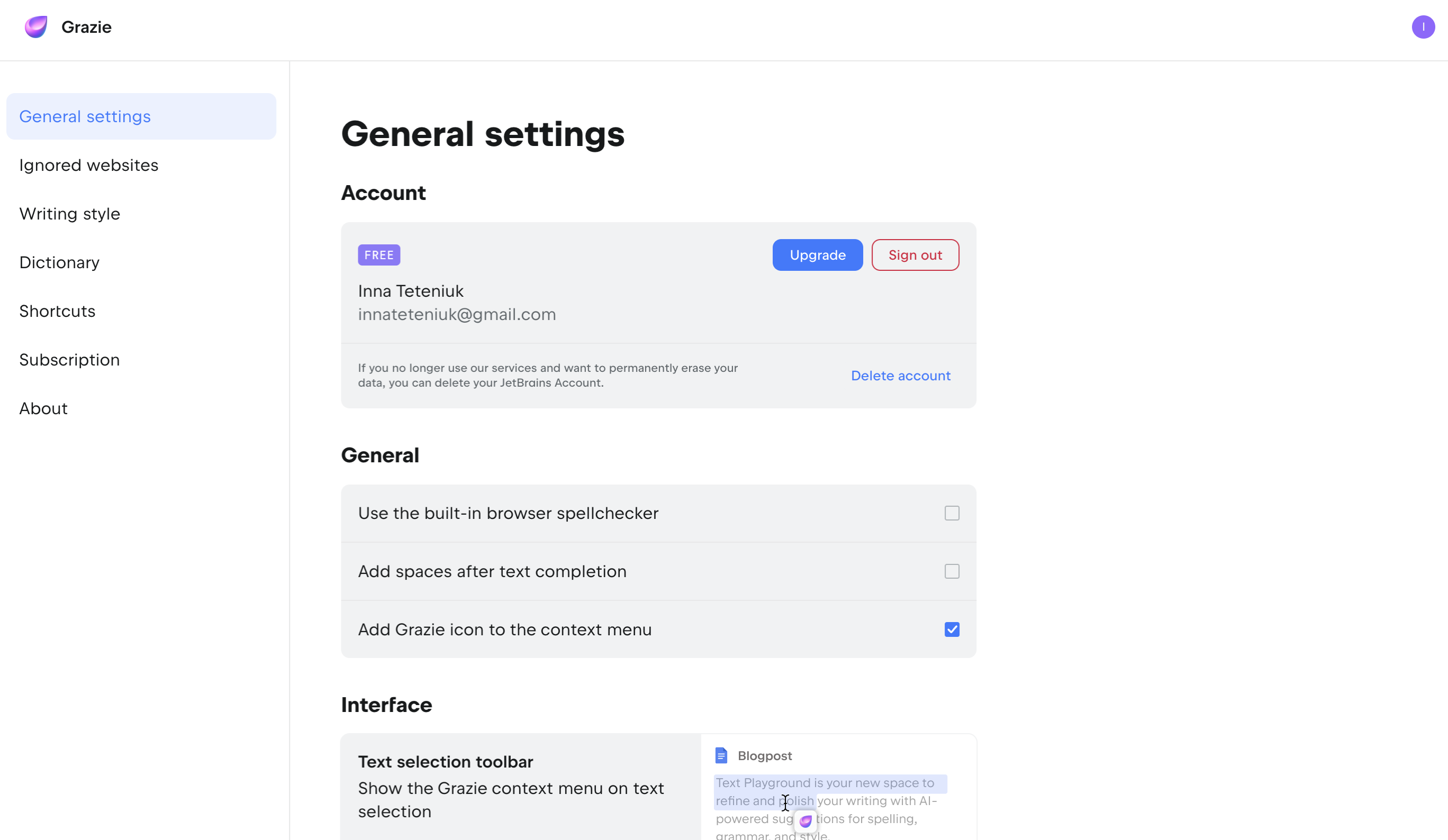 The General settings page lets you view your account details and configure Grazie interface settings, the availability of writing assistance features, and personal data processing settings.