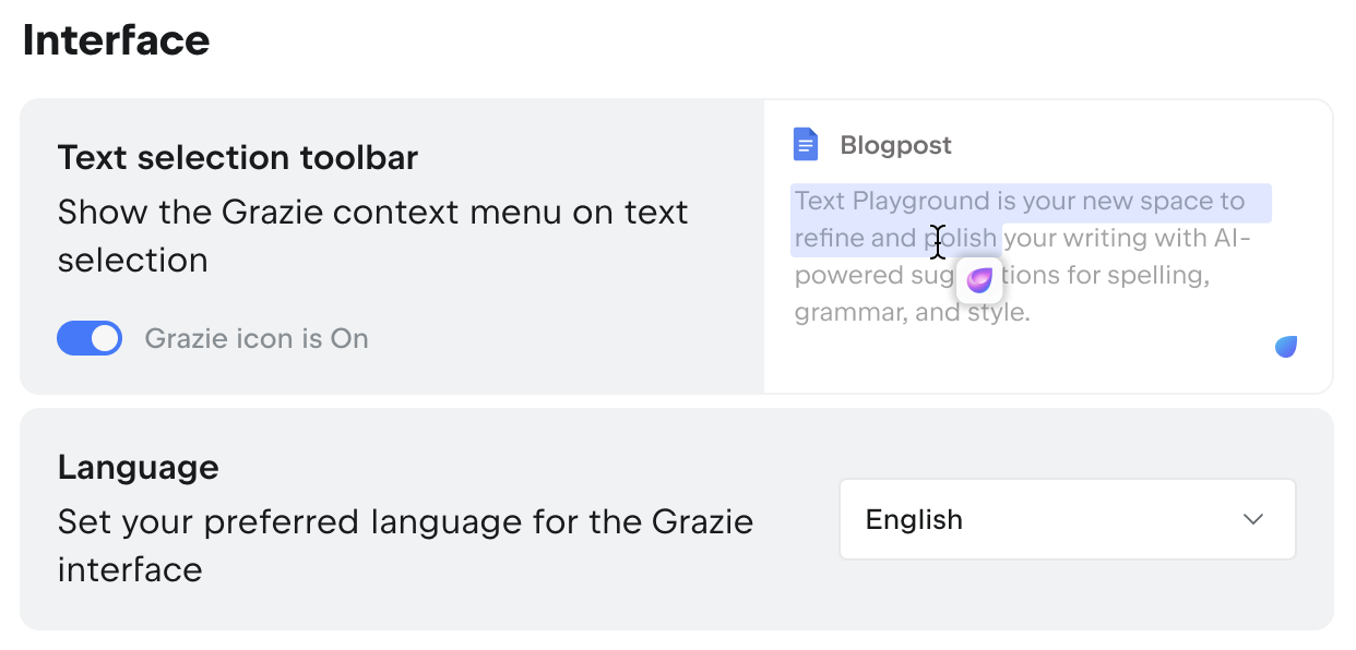 Text selection toolbar | When enabled, the Grazie icon appears when you select text. |