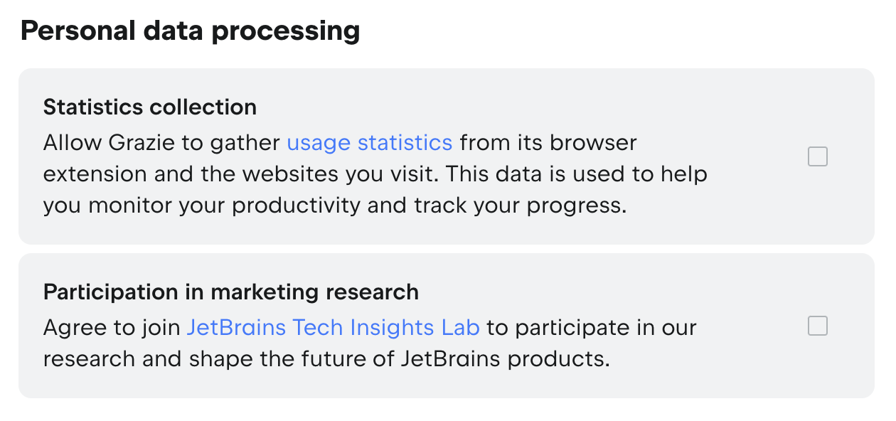 Statistics collection | Enables Grazie usage statistics gathering. |