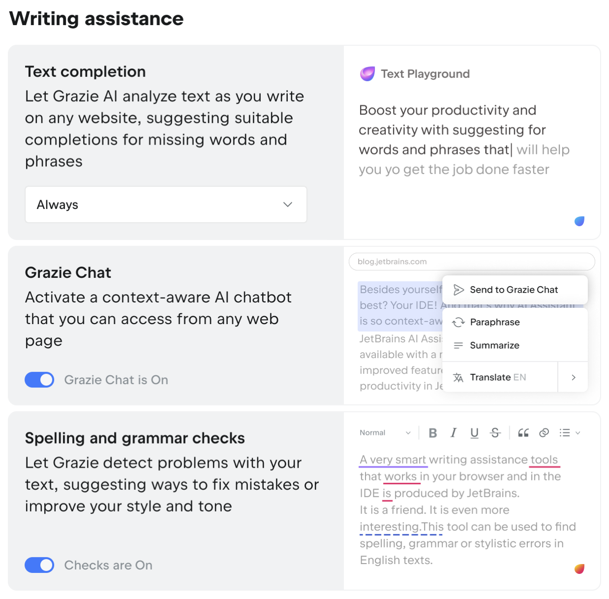 The Writing assistance section lets you manage grammar and spelling checks, text completion profiles, and Grazie Chat availability.