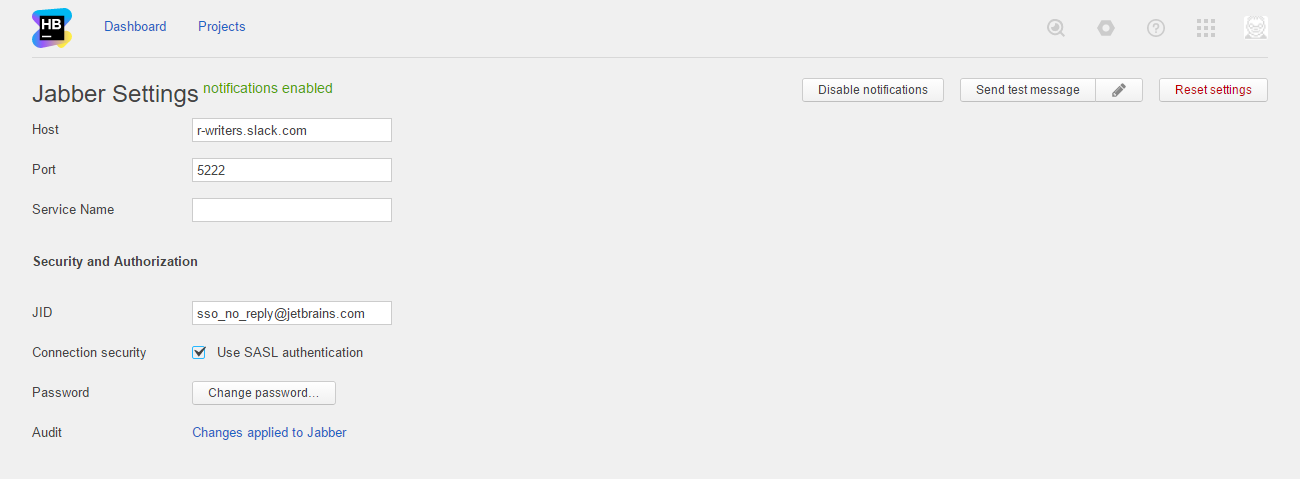 On the Jabber Settings page, you configure the connection between Hub and a Jabber service. This lets you use Hub to verify the Jabber credentials in connected services that use Jabber for notifications.