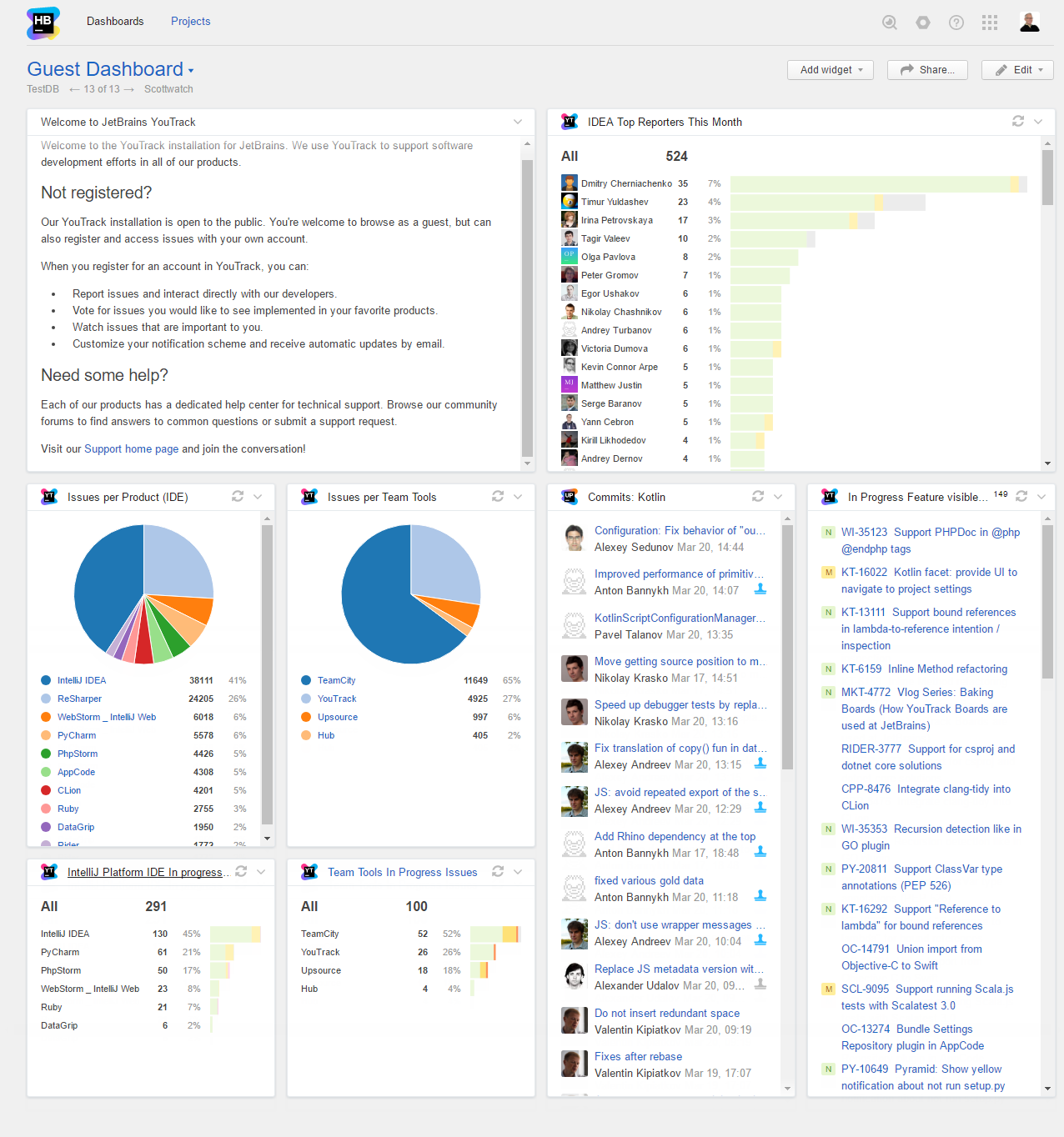 Take a look at a guest dashboard that we built for the JetBrains YouTrack installation.