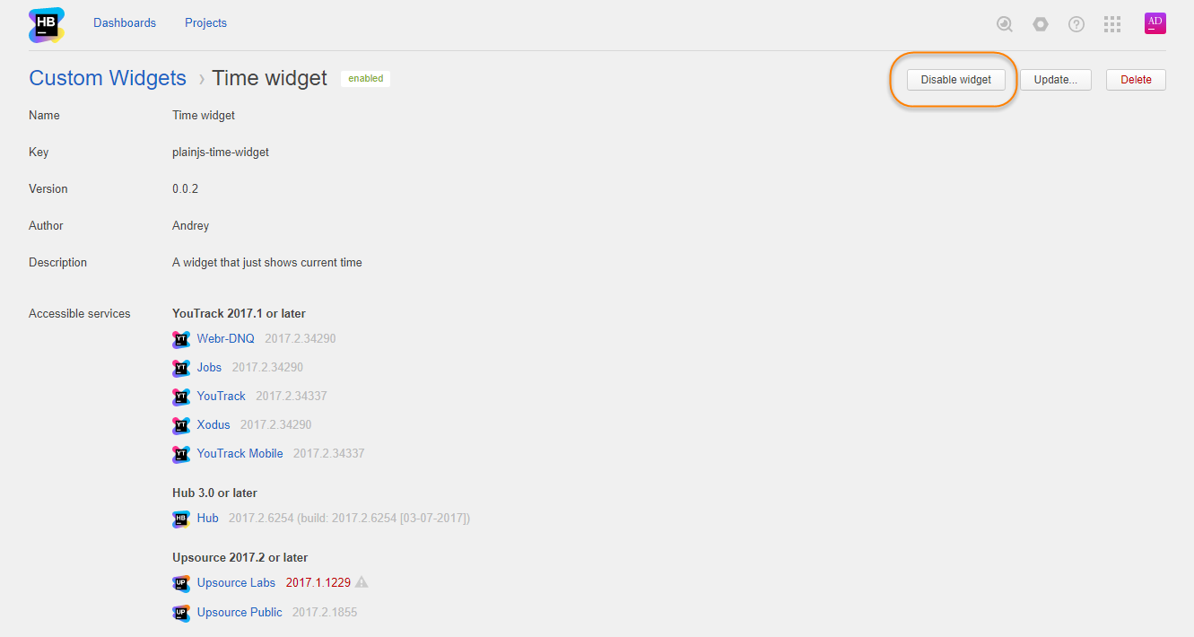 If you no longer want users to work with a custom widget, but don't want to delete it from Hub, you can disable the widget indefinitely.