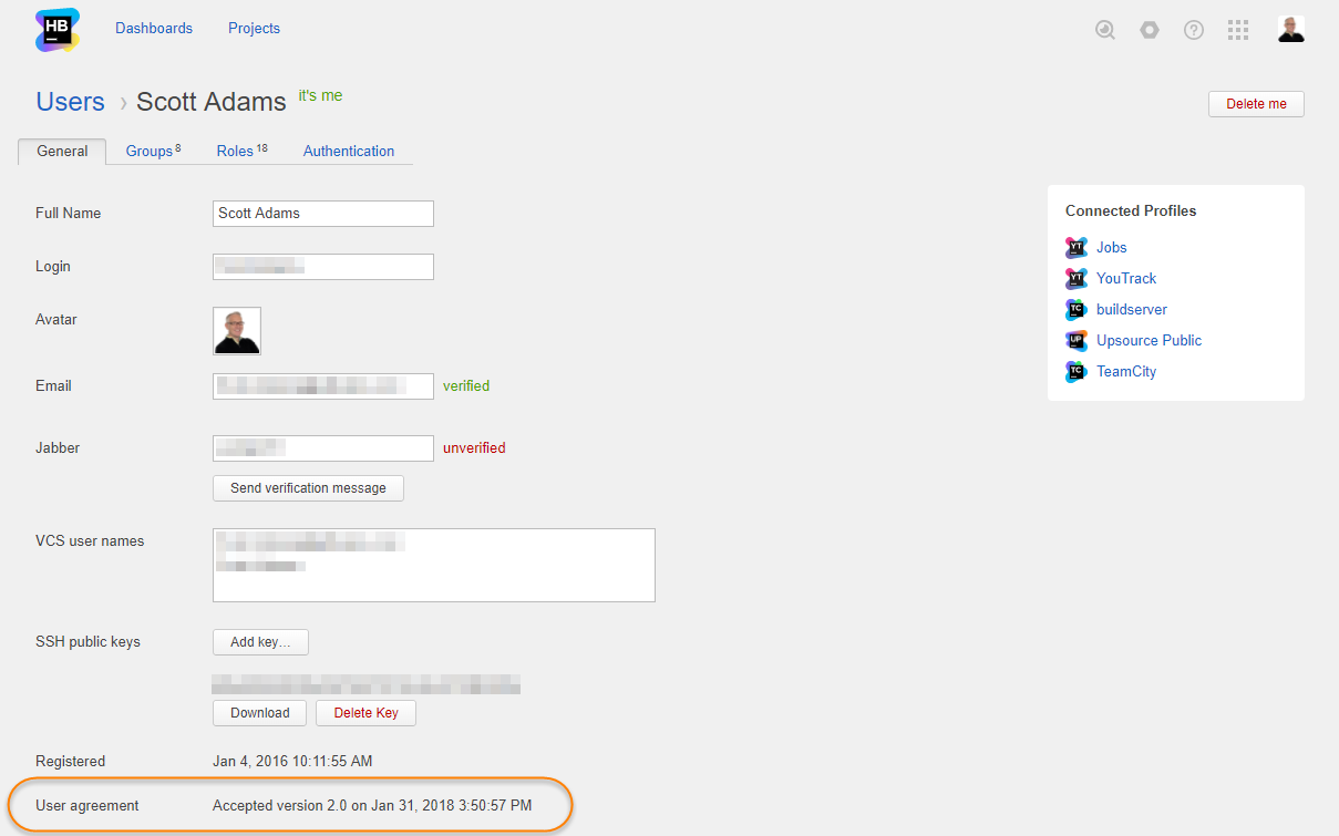 Another means of proving that you work within the guidelines for data processing is the ability to track user acceptance of the agreement. In Hub, this information is displayed in the profile for each user account.