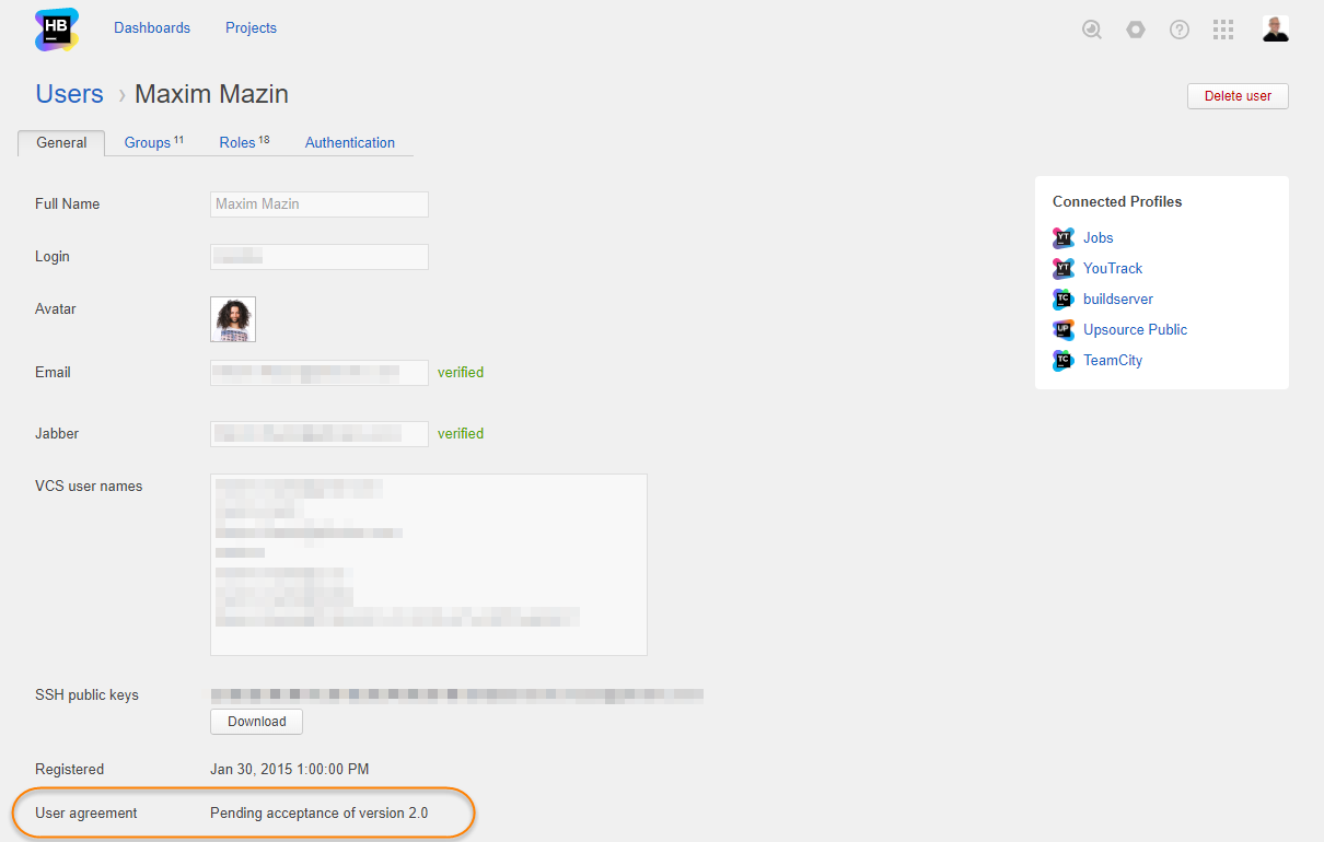 - If the user has not yet accepted an agreement, the User agreement shows that acceptance of the current version is pending.