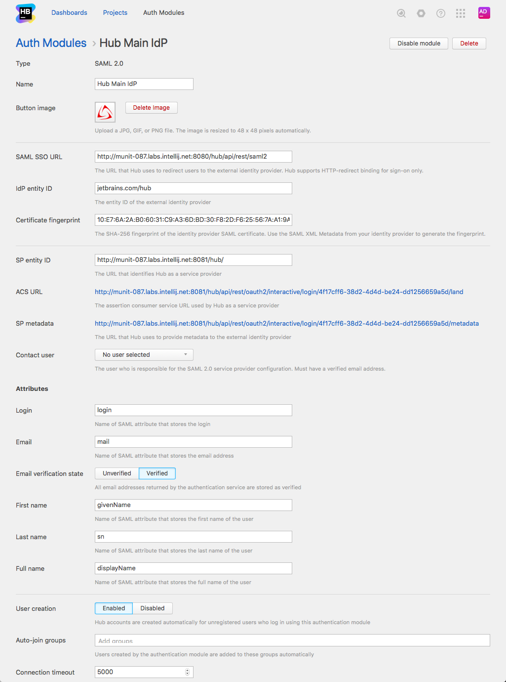 Configure created auth module: Provide the names of the SAML attributes of the user accounts.