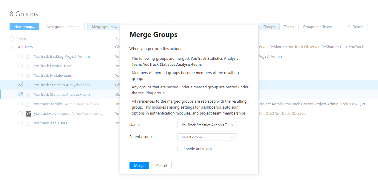 When you have organizational changes or encounter groups with overlapping access rights, you can merge one or more groups into a single group. This action is available on the Groups page.