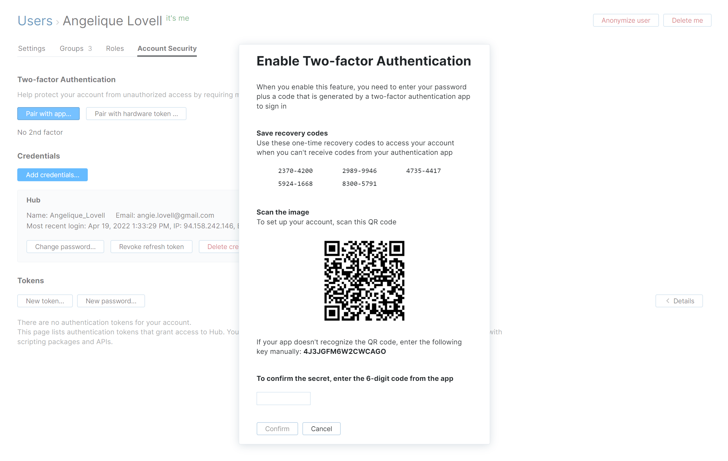 When you pair your account with an authentication app, Hub generates a set of one-time recovery codes. These codes let you log in to your account even when you don't have access to your authentication app.