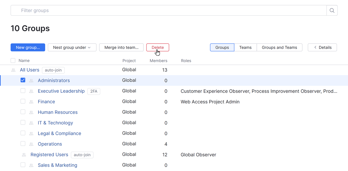 When you encounter groups in Hub that are no longer used or were created for a project that is no longer active, you can delete them from the system. You can delete groups from the Groups list, or directly on the group profile page.