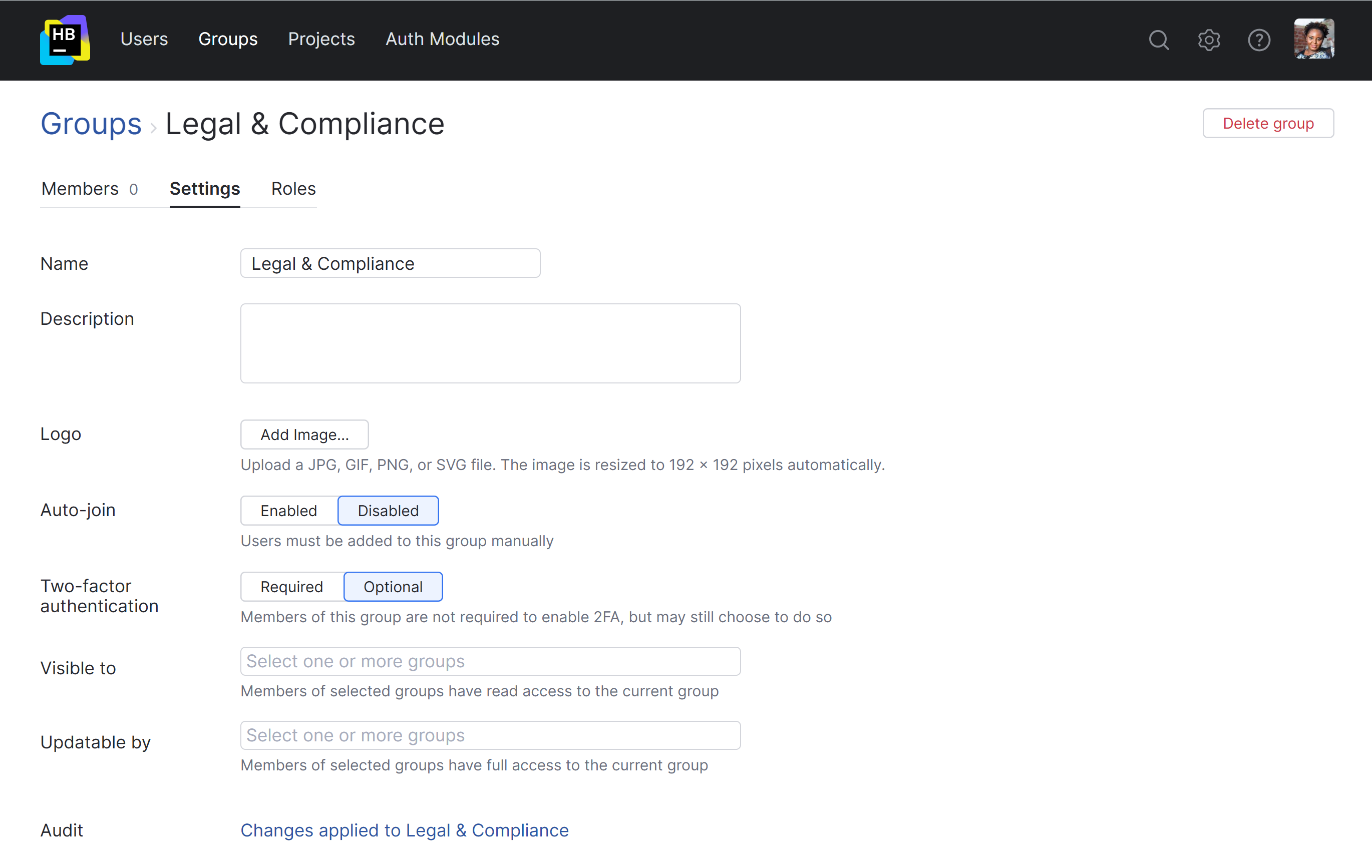 • When enabled, group members are required to set up two-factor authentication (2FA) for their Hub accounts. Access rights for members of this group who have not enabled 2FA are restricted to Update Self. Once a user has enabled 2FA, the access rights that are granted to their account are restored.