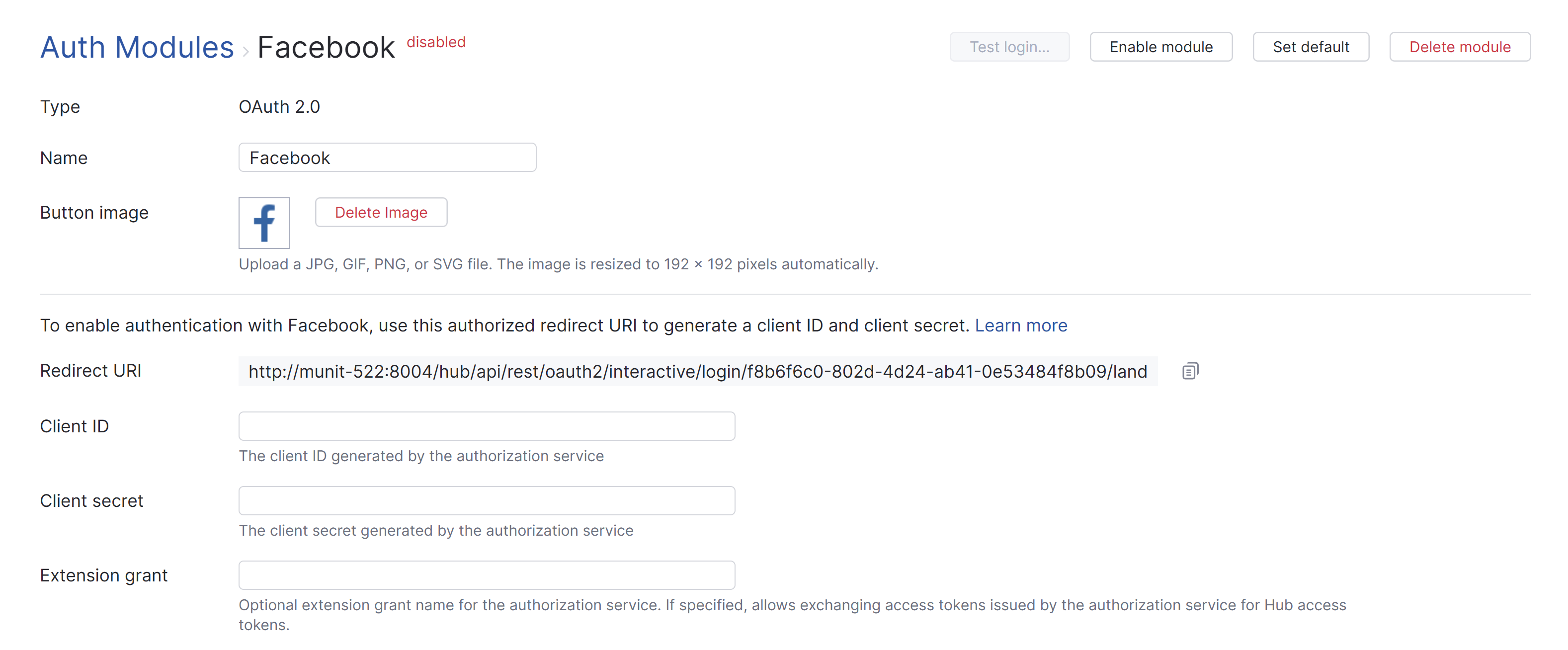 First, create the Facebook authentication module. When you perform this action, Hub generates a redirect URI to use with the authorization service.
