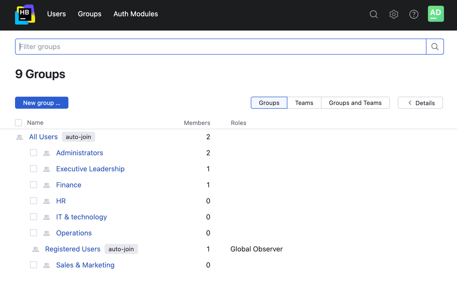 The Groups page also contains a list of all the project teams in Hub. As you have exactly one project team for every Hub project, this is basically an overview that shows you how many members are assigned to each project team and which roles are assigned to the team in each project.