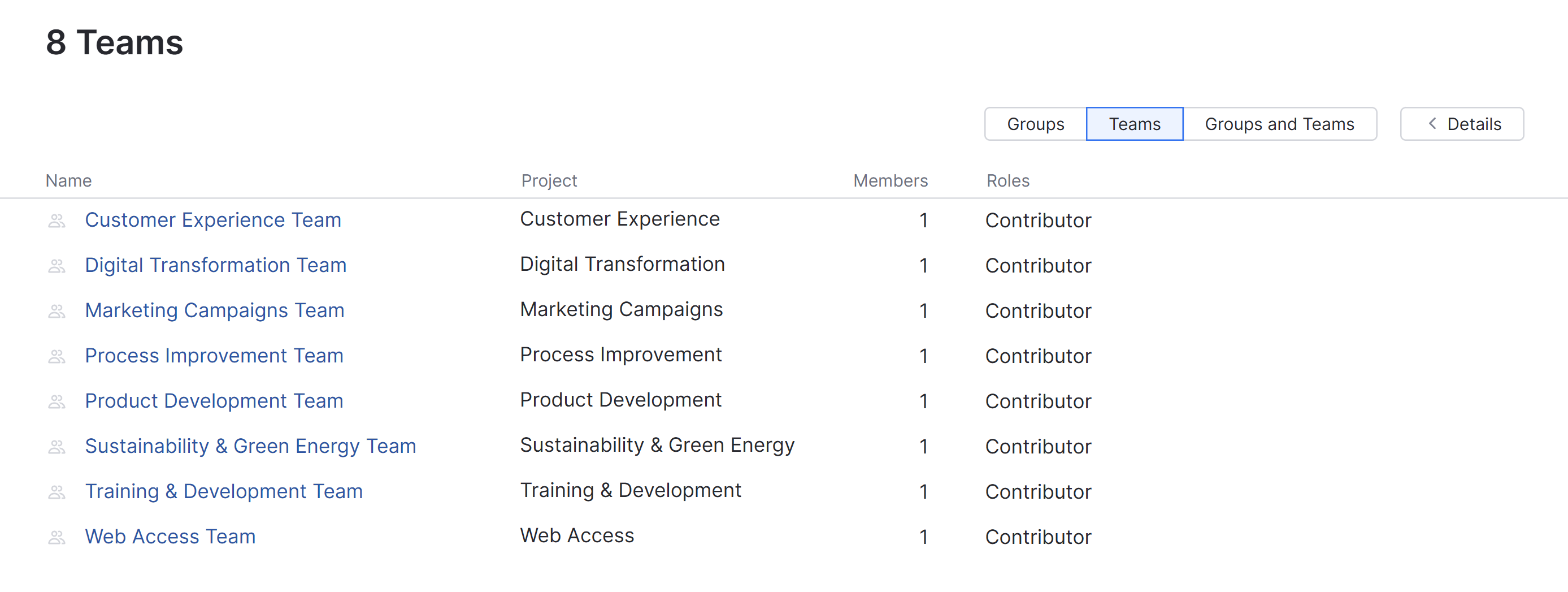 • Select a project team in the list to display additional information in the Details sidebar.