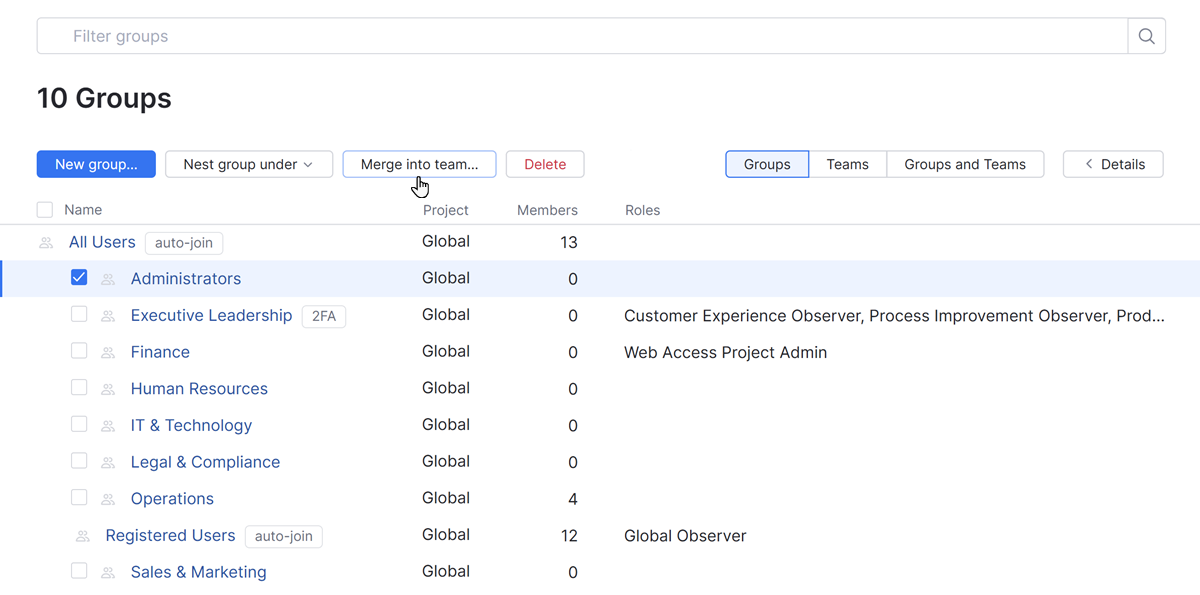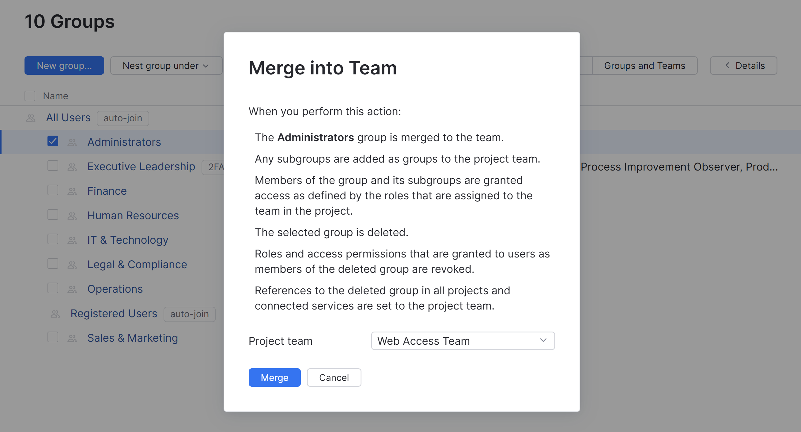 Most of the groups that could be safely merged into a project team without resulting in a permission loss have already been merged. However, you may still have groups that can be merged into a project team without affecting access rights in other projects. If you encounter a group that duplicates the memberships and role assignments that are available to users as members of a project team, you can merge it into a project team from the Groups tab. Use the list on the Groups and Teams tab to double-check the roles that are assigned to the group and the project team before you perform this operation.