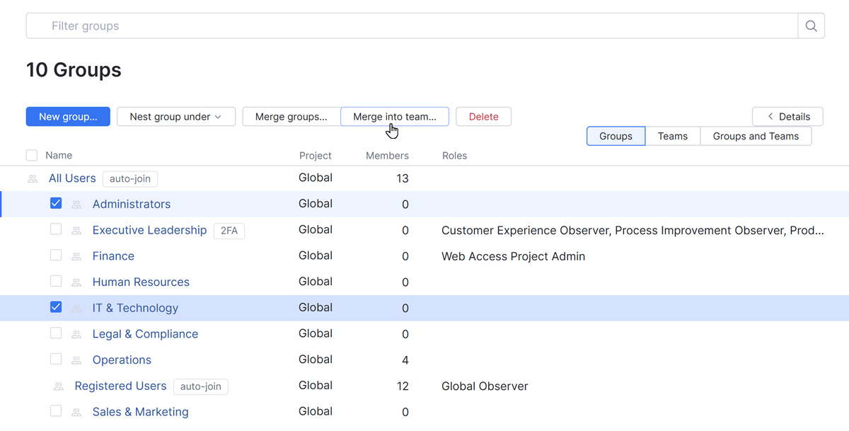 Note that you can perform this action for multiple groups at once. When you select multiple groups, the Merge into team option is shown next to the Merge groups button in the toolbar.