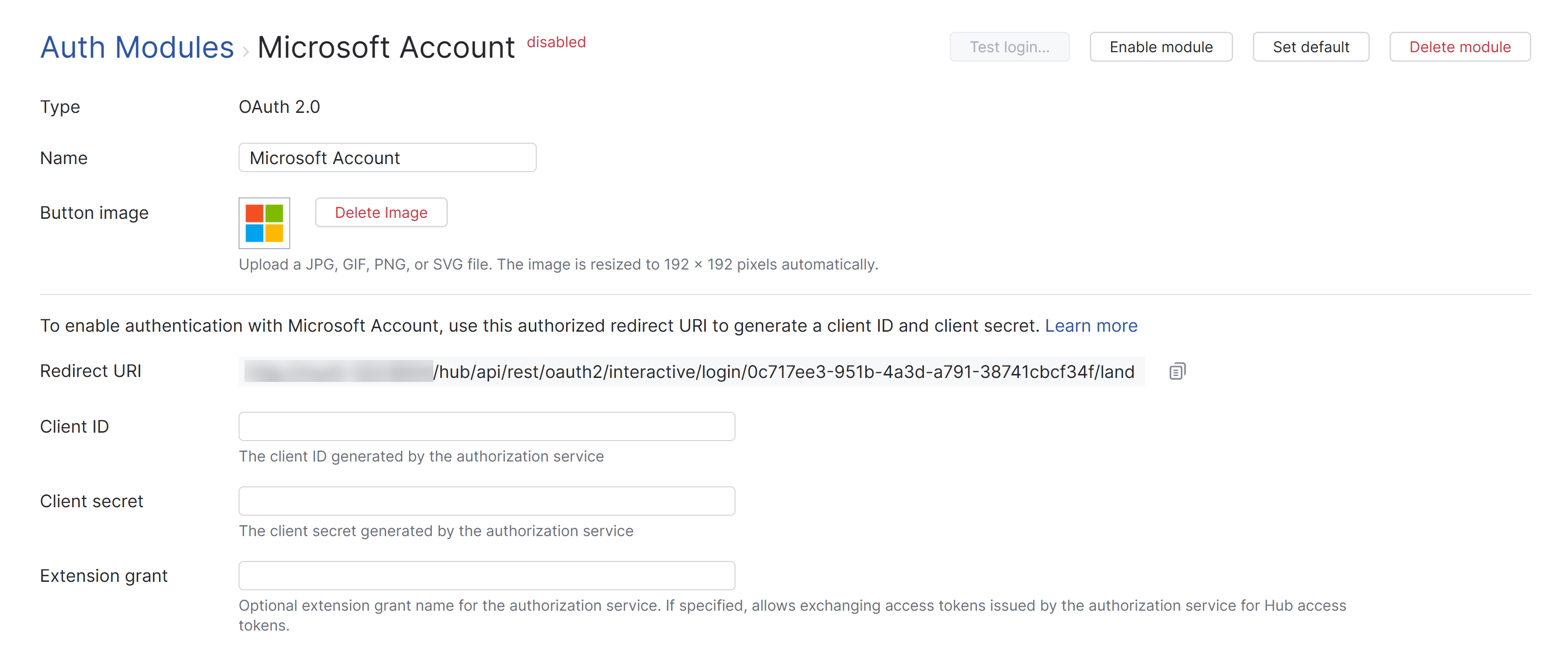 First, create the Microsoft Account authentication module. When you perform this action, Hub generates a redirect URI to use with the authorization service.
