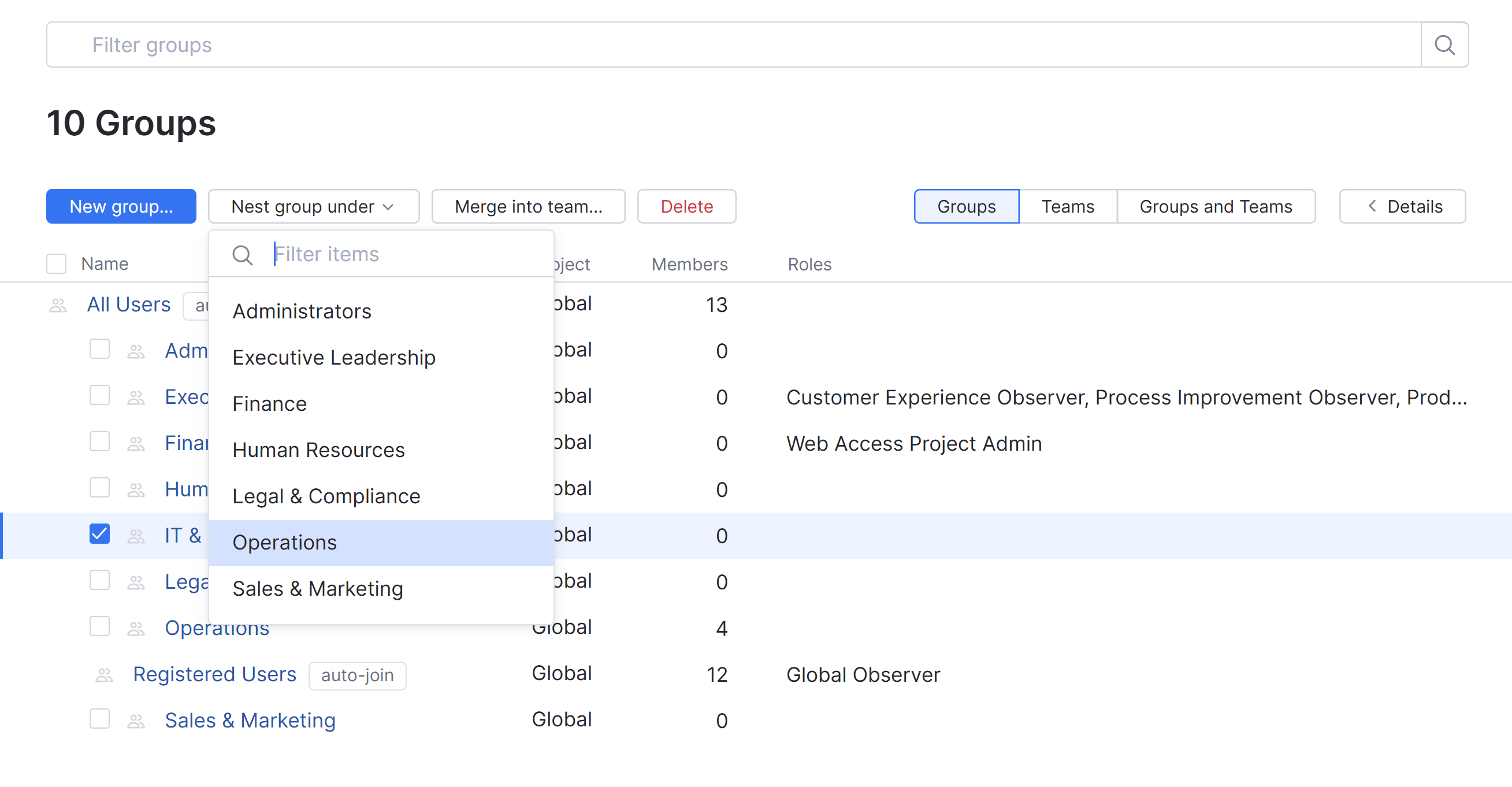 Manage access to multiple projects | You need to grant users specific roles in multiple projects. For example, you have separate projects to manage the marketing efforts for different products and your marketing managers need access to all of them. However, there are one or two managers who need access to a side project that doesn't involve any of the other members of the team. Here, you can create one group that provides access to the set of common projects then nest the group that provides access to the side projects under it. The managers that you add to the nested group have access to all projects, while the managers who are members of the parent group don't have access to the side project. |