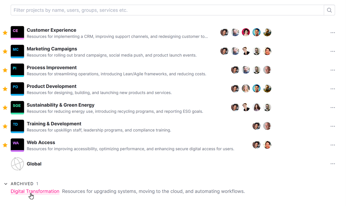 2. Click to expand the list of Archived projects at the bottom of the list.