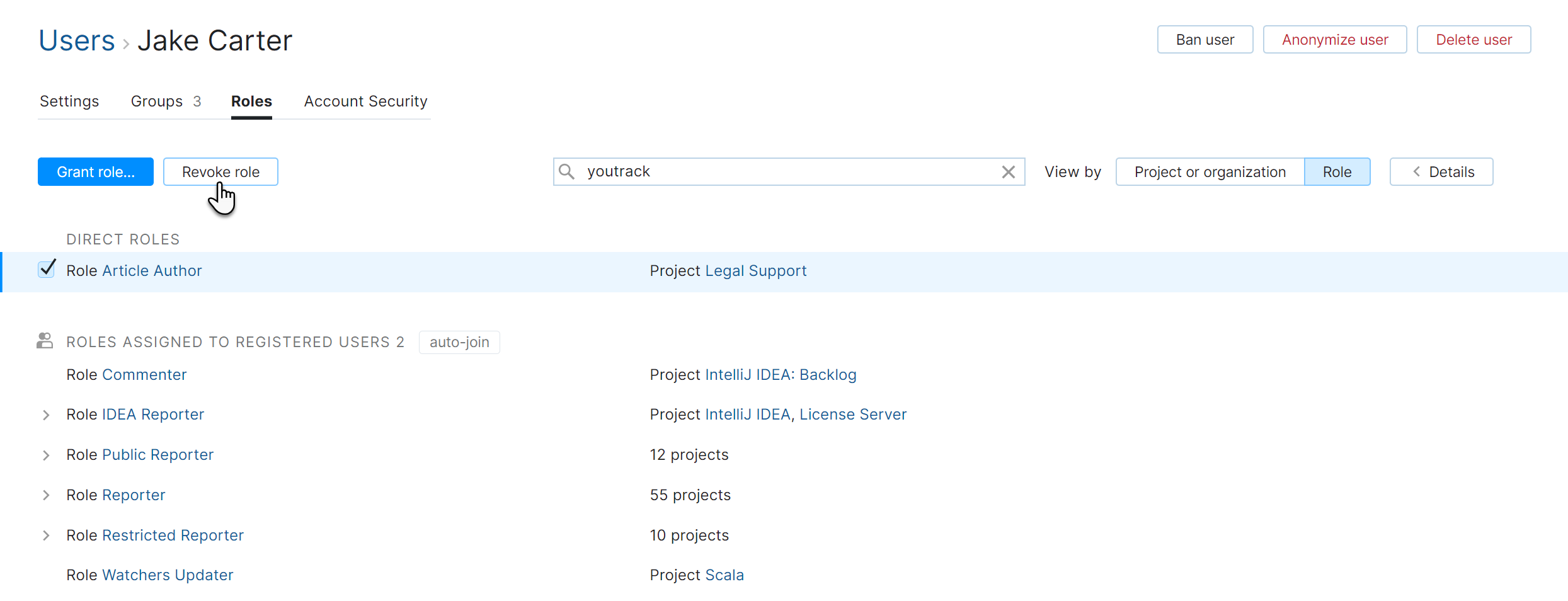 If a user no longer requires access that is granted by a role, you can revoke the role assignment. This procedure only applies to roles that are assigned directly to a user.