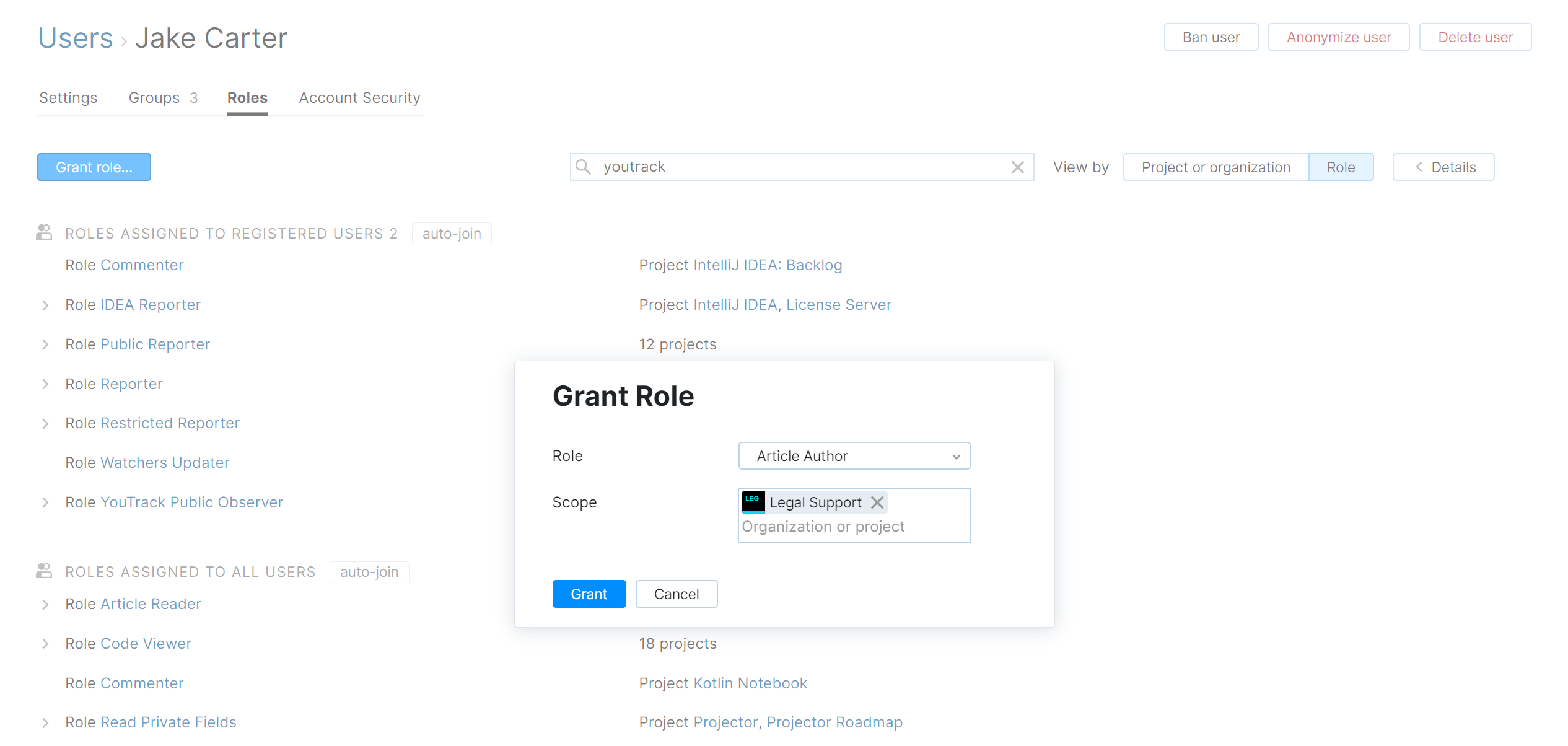 6. In the Grant Role dialog, choose a role to assign to the user.